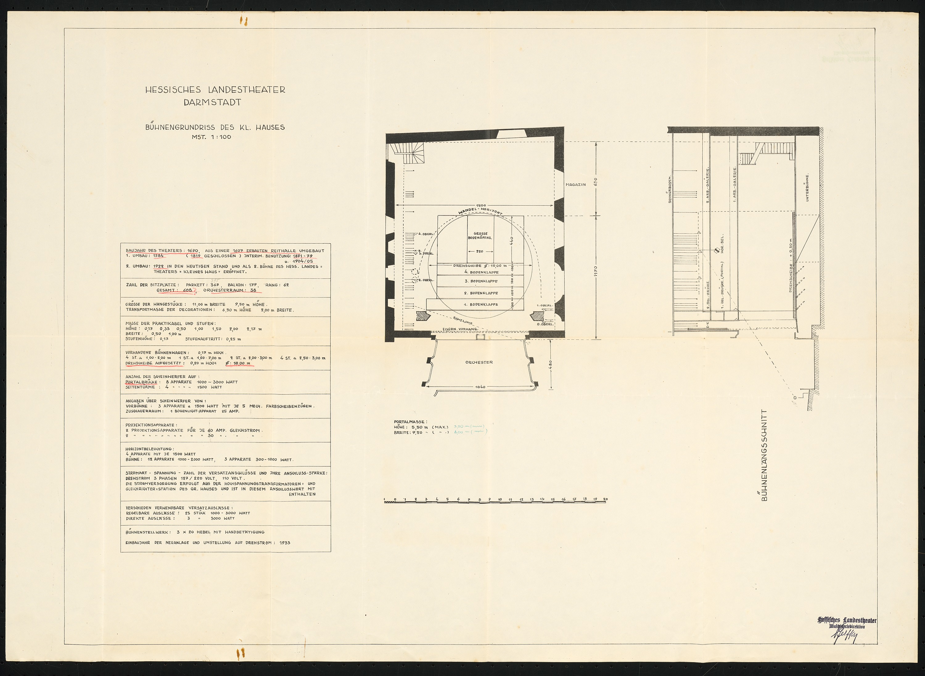Bühnengrundriss und Bühnenlängsschnitt 1:100