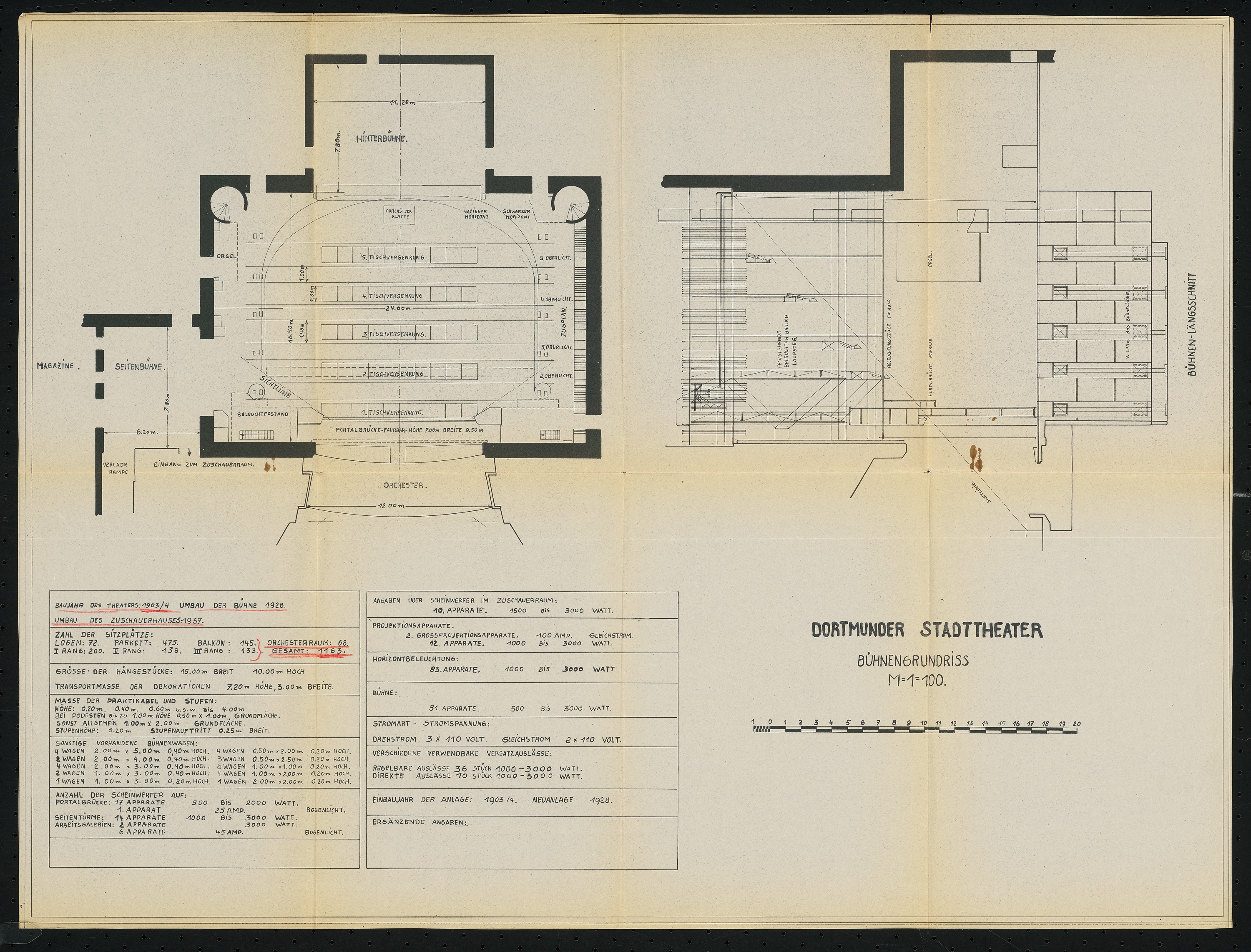 Bühnengrundriss und Bühnenlängsschnitt 1:100