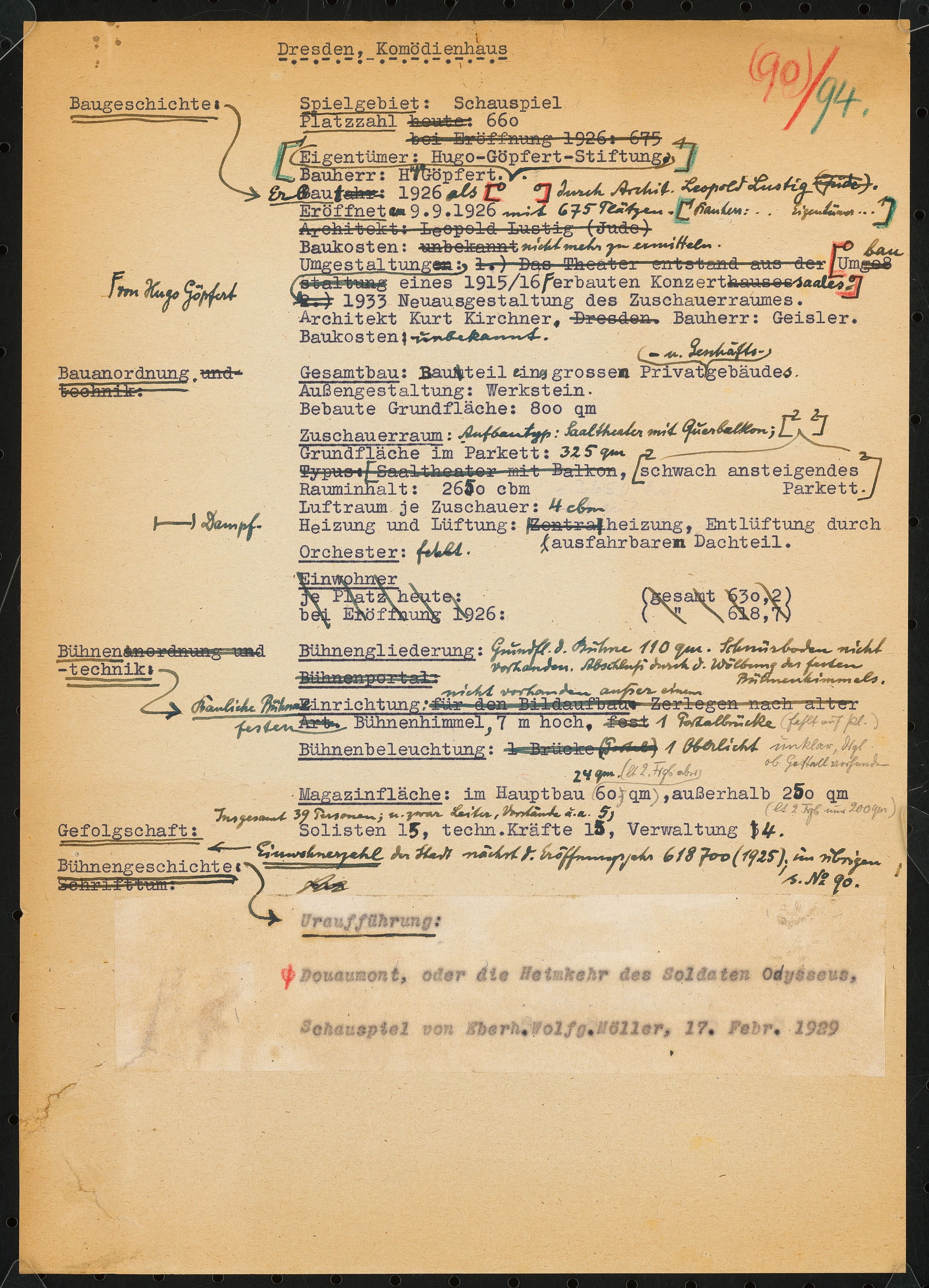 Schriftstück zum Fragebogen für das Handbuch »Das Deutsche Theater«