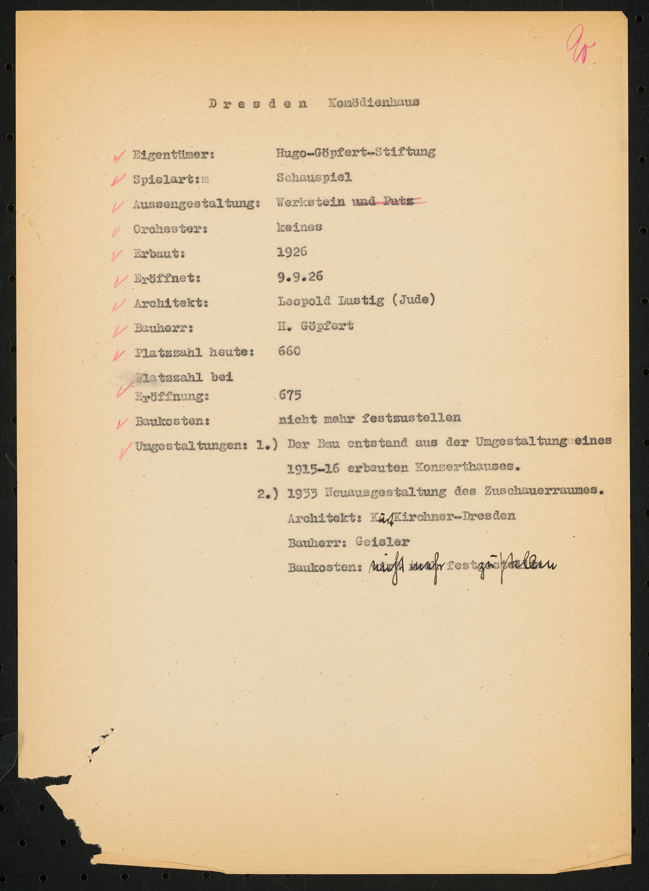 Schriftstück zum Fragebogen für das Handbuch »Das Deutsche Theater«