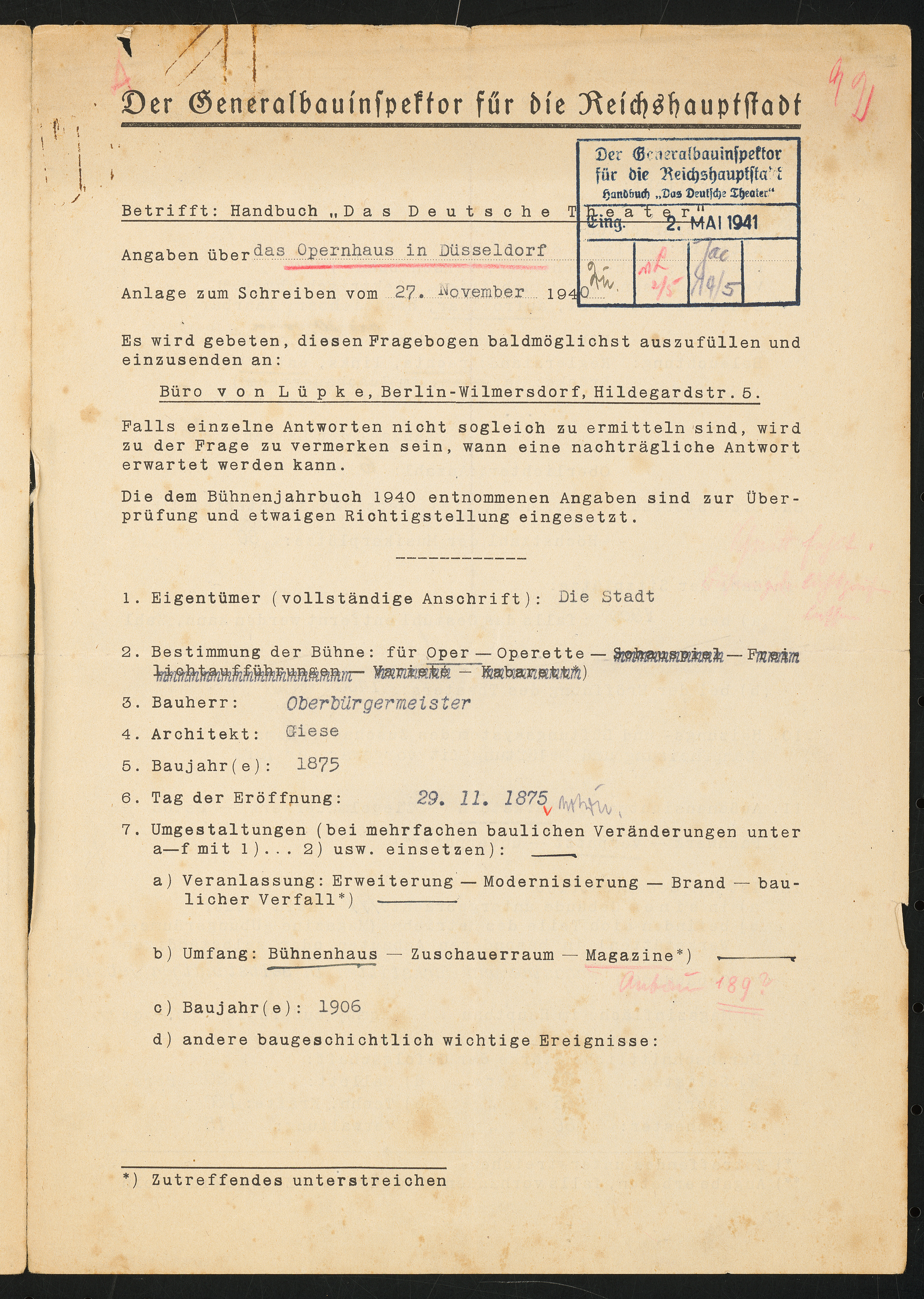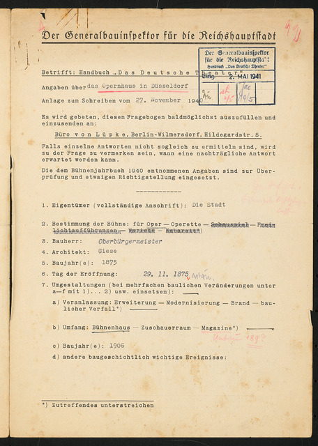 Fragebogen für das Handbuch »Das Deutsche Theater«, vierseitiges Dokument