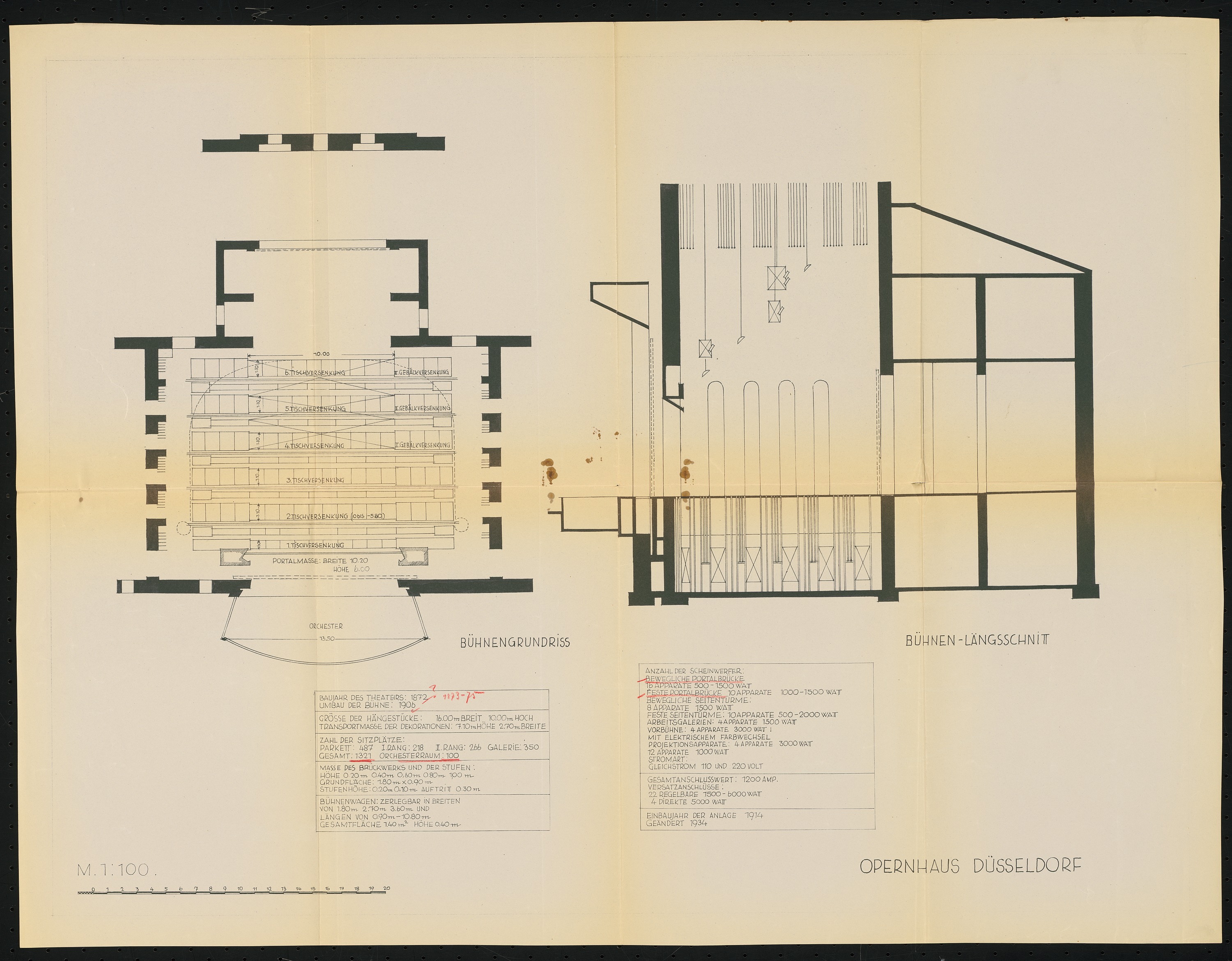 Bühnengrundriss und Bühnenlängsschnitt 1:100