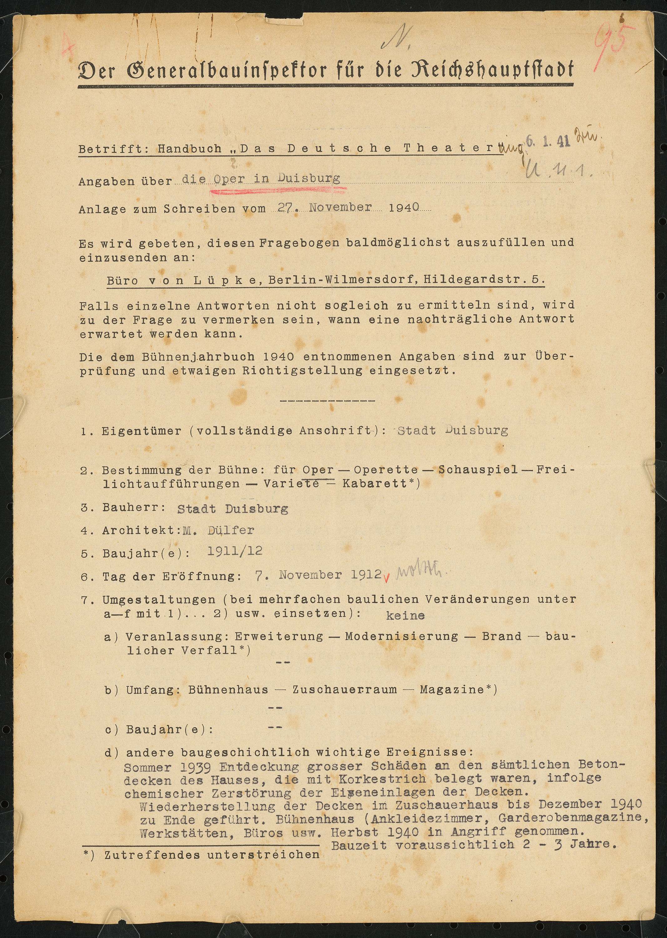 Fragebogen für das Handbuch »Das Deutsche Theater«, vierseitiges Dokument