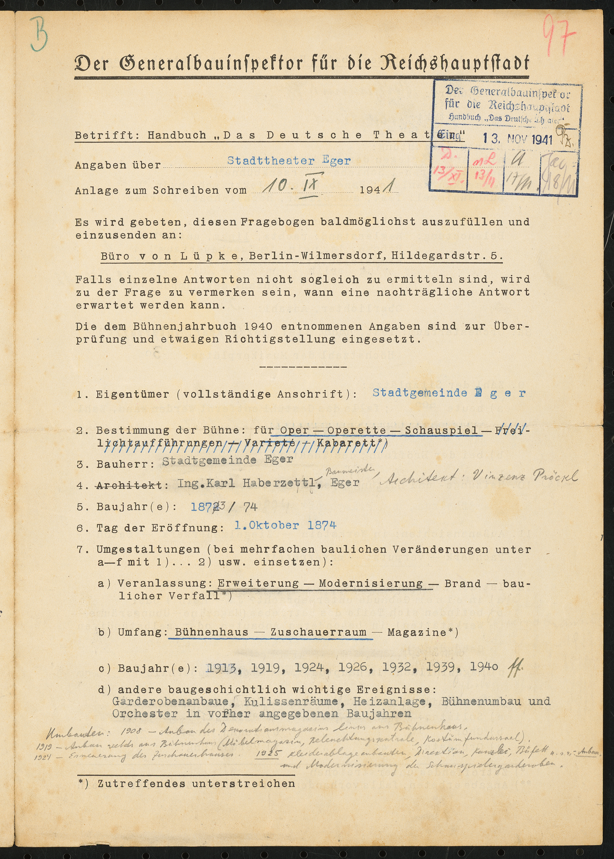 Fragebogen für das Handbuch »Das Deutsche Theater«, vierseitiges Dokument