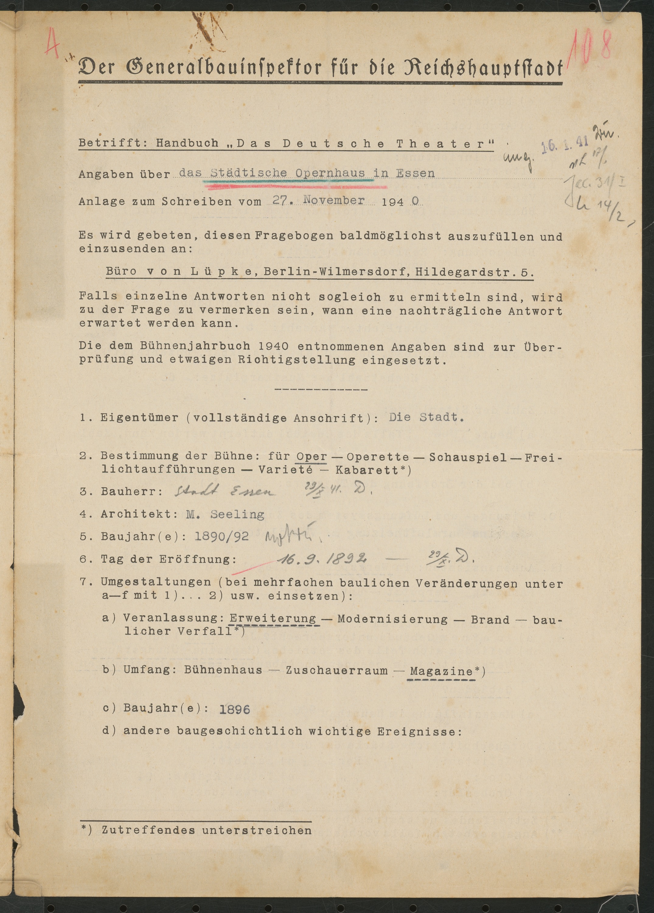 Fragebogen für das Handbuch »Das Deutsche Theater«, vierseitiges Dokument