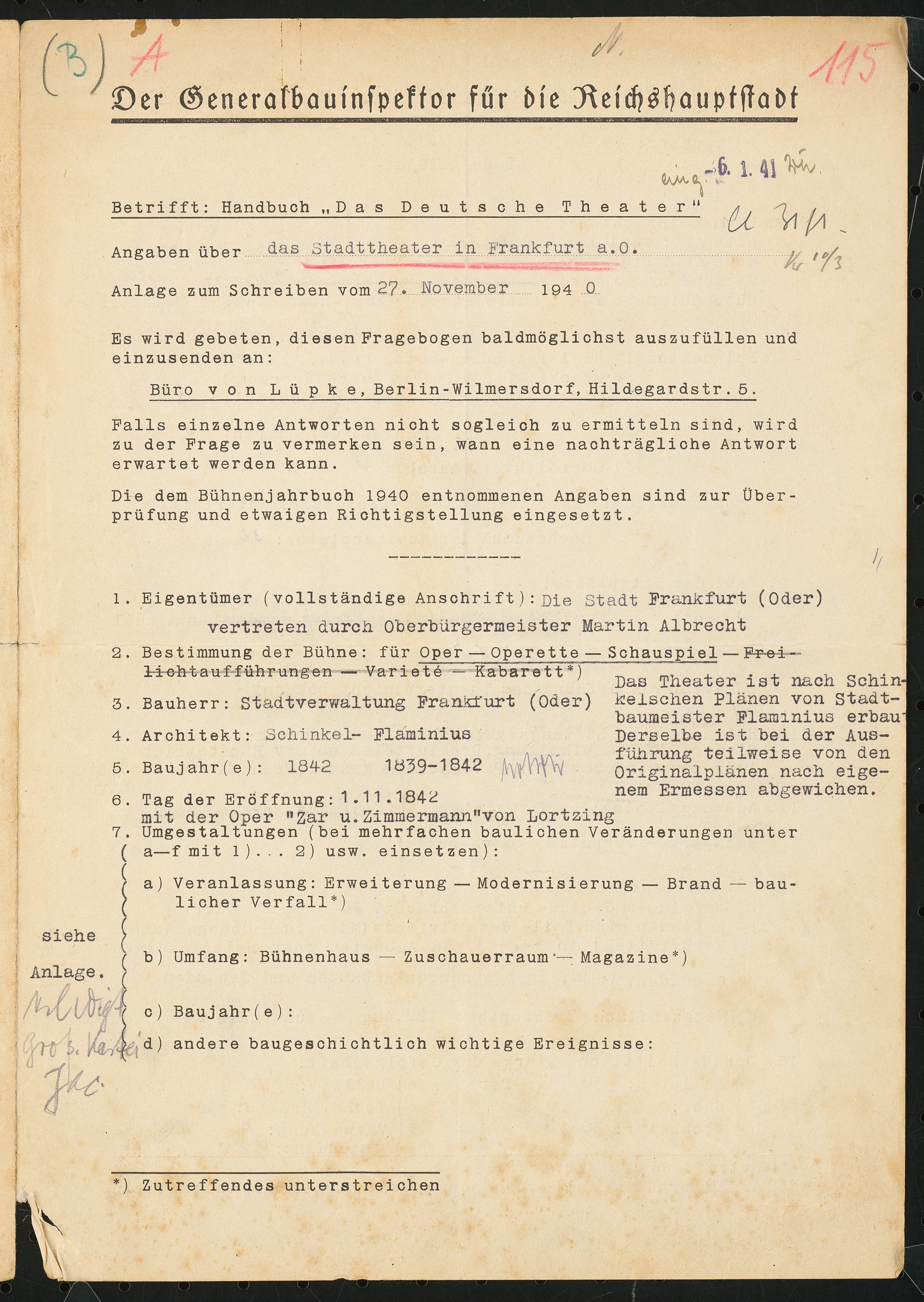 Fragebogen für das Handbuch »Das Deutsche Theater«, vierseitiges Dokument
