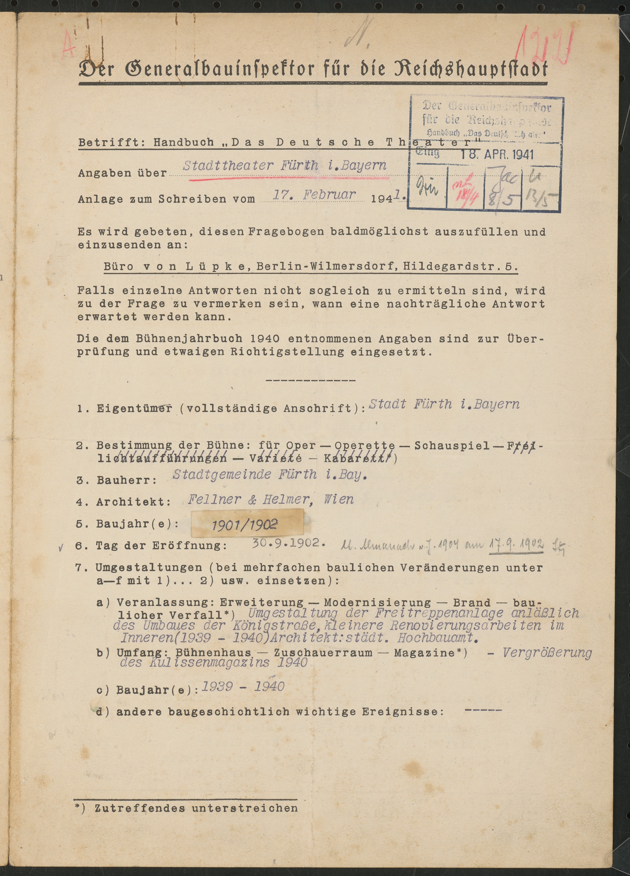 Fragebogen für das Handbuch »Das Deutsche Theater«, vierseitiges Dokument