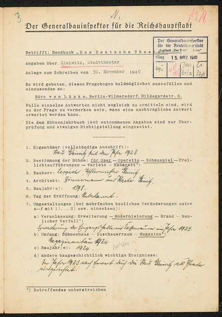 Fragebogen für das Handbuch »Das Deutsche Theater«, vierseitiges Dokument