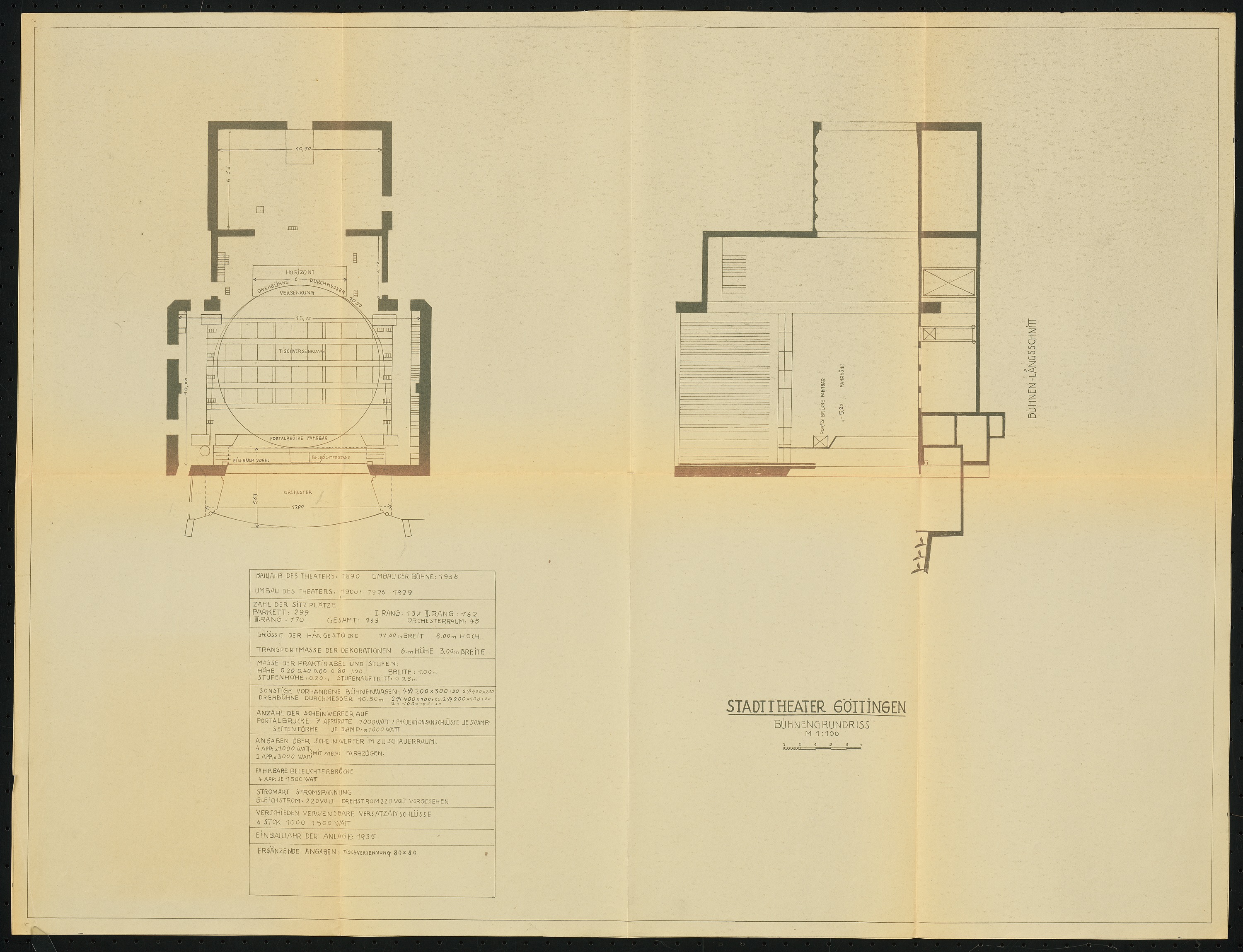 Bühnengrundriss und Bühnenlängsschnitt 1:100