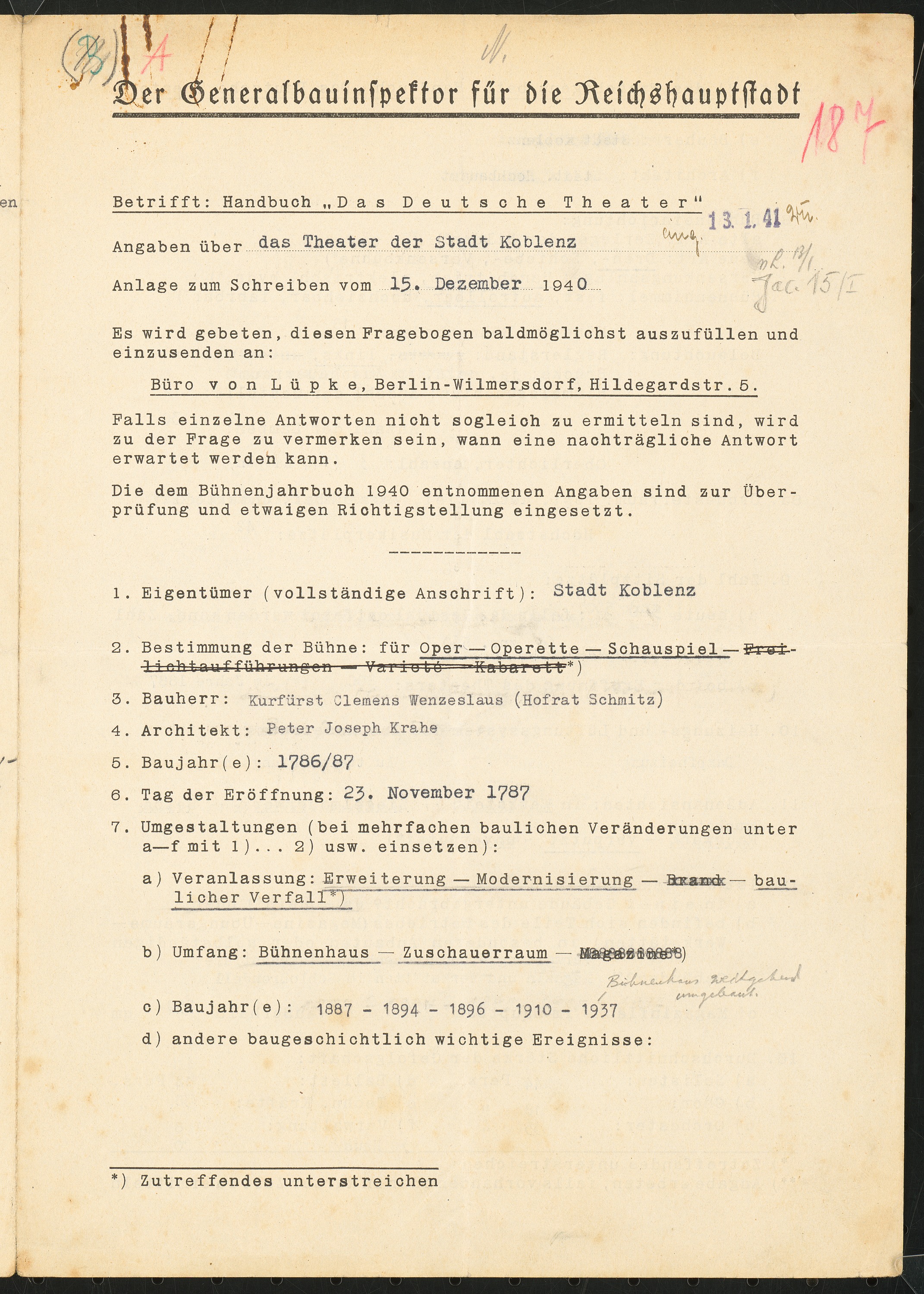 Fragebogen für das Handbuch »Das Deutsche Theater«, vierseitiges Dokument