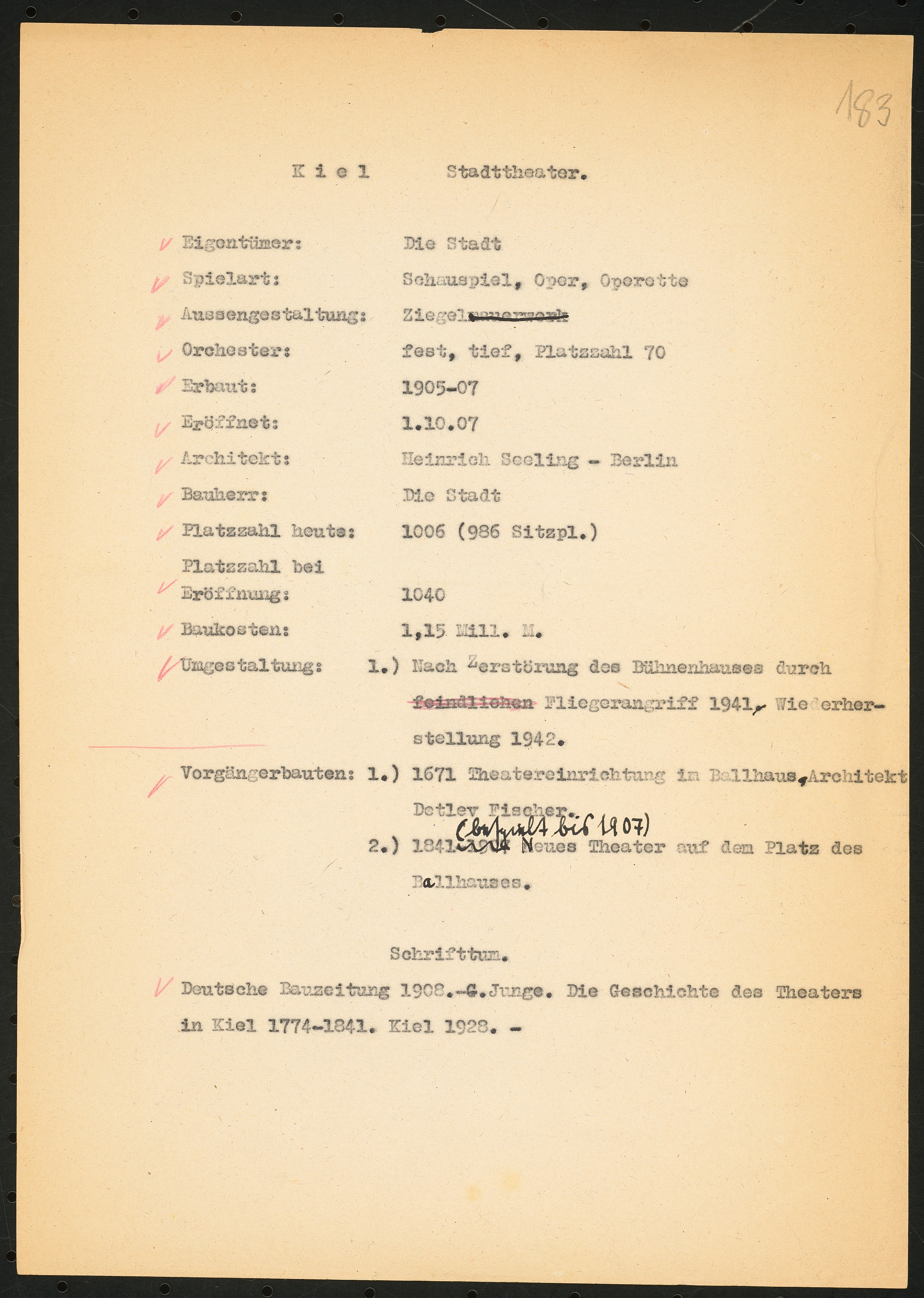 Schriftstück zum Fragebogen für das Handbuch »Das Deutsche Theater«, zwei Seiten