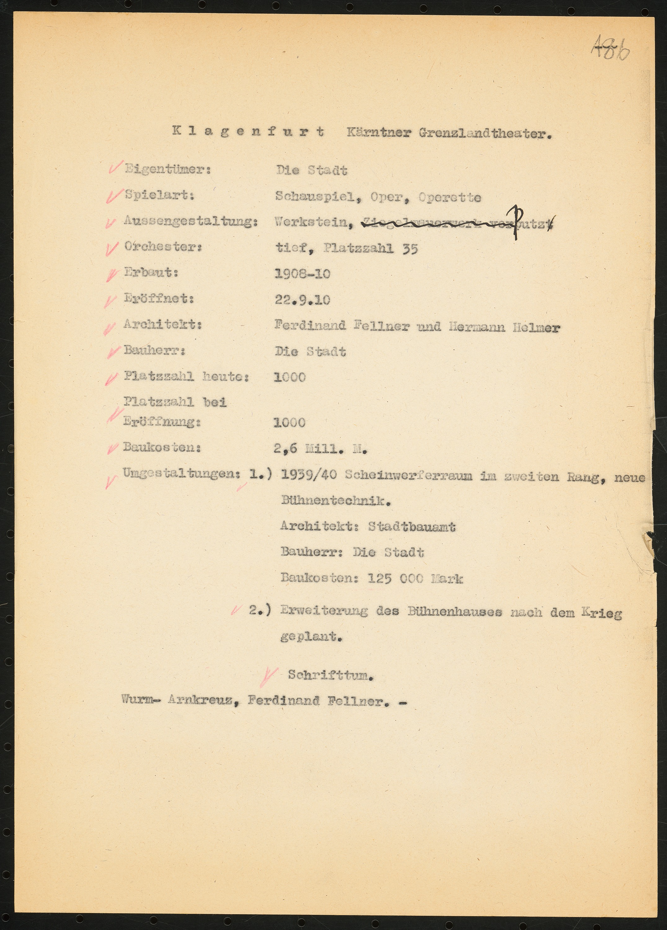 Schriftstück zum Fragebogen für das Handbuch »Das Deutsche Theater«