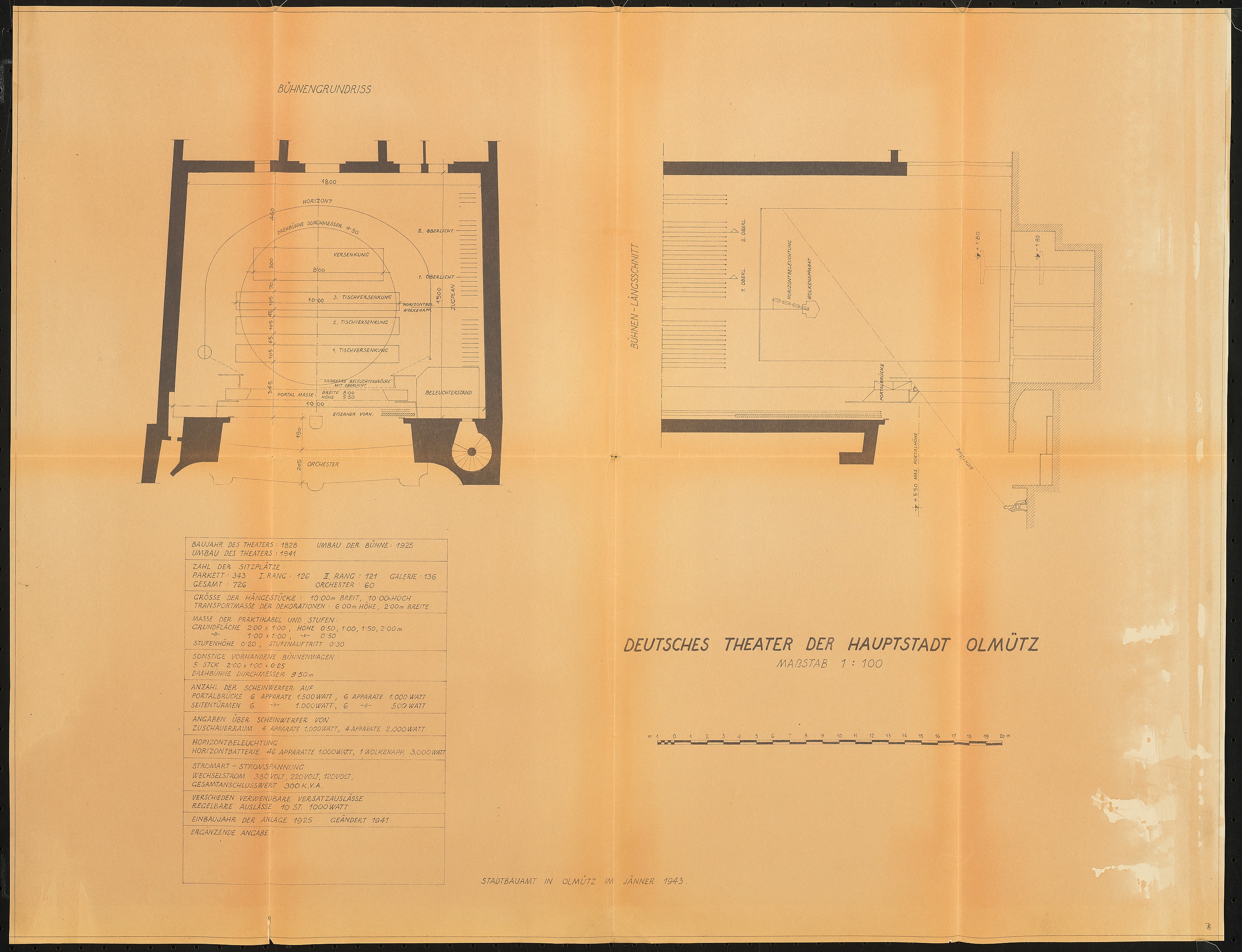 Bühnengrundriss und Bühnenlängsschnitt 1:100