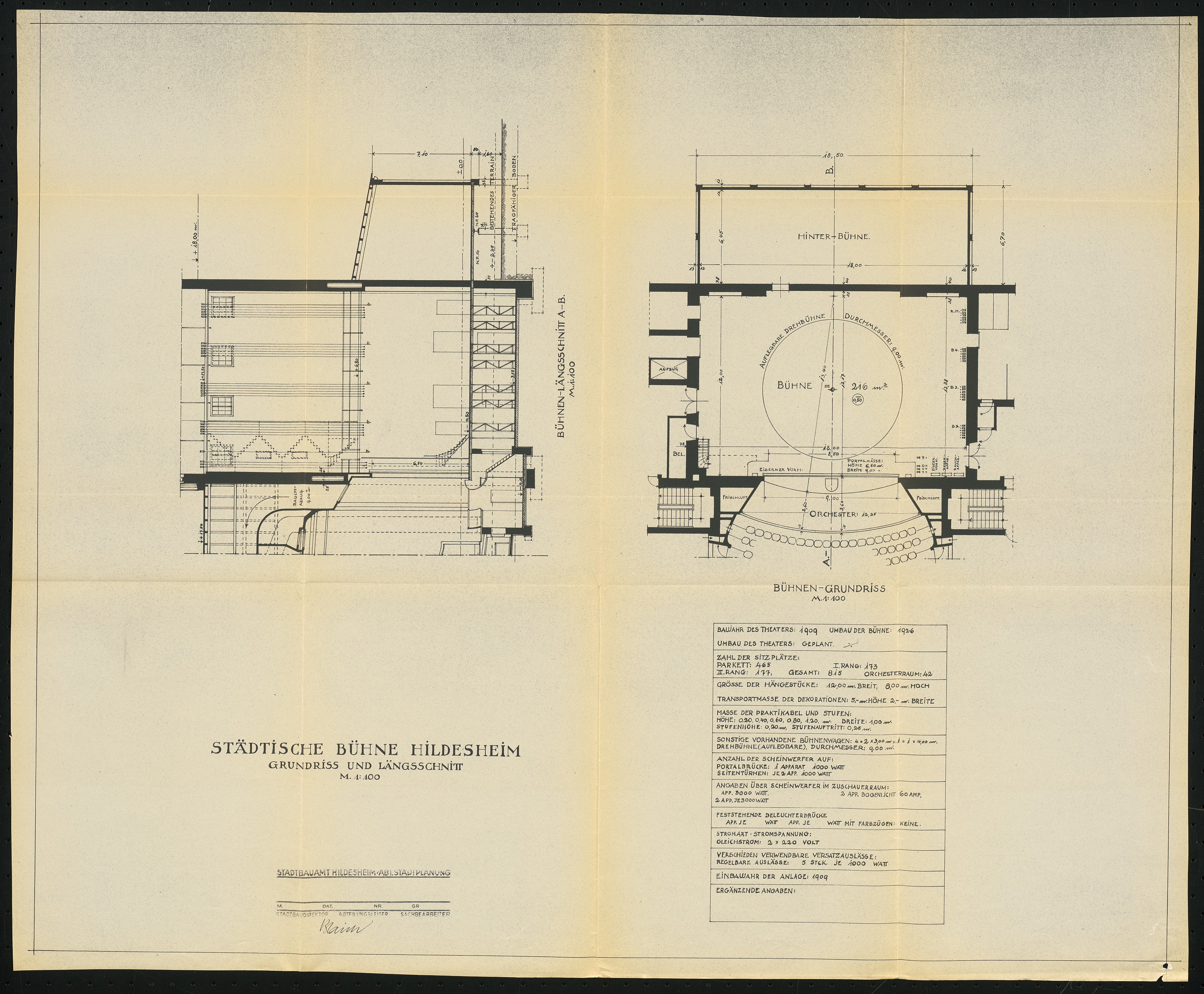Bühnengrundriss und Bühnenlängsschnitt 1:100