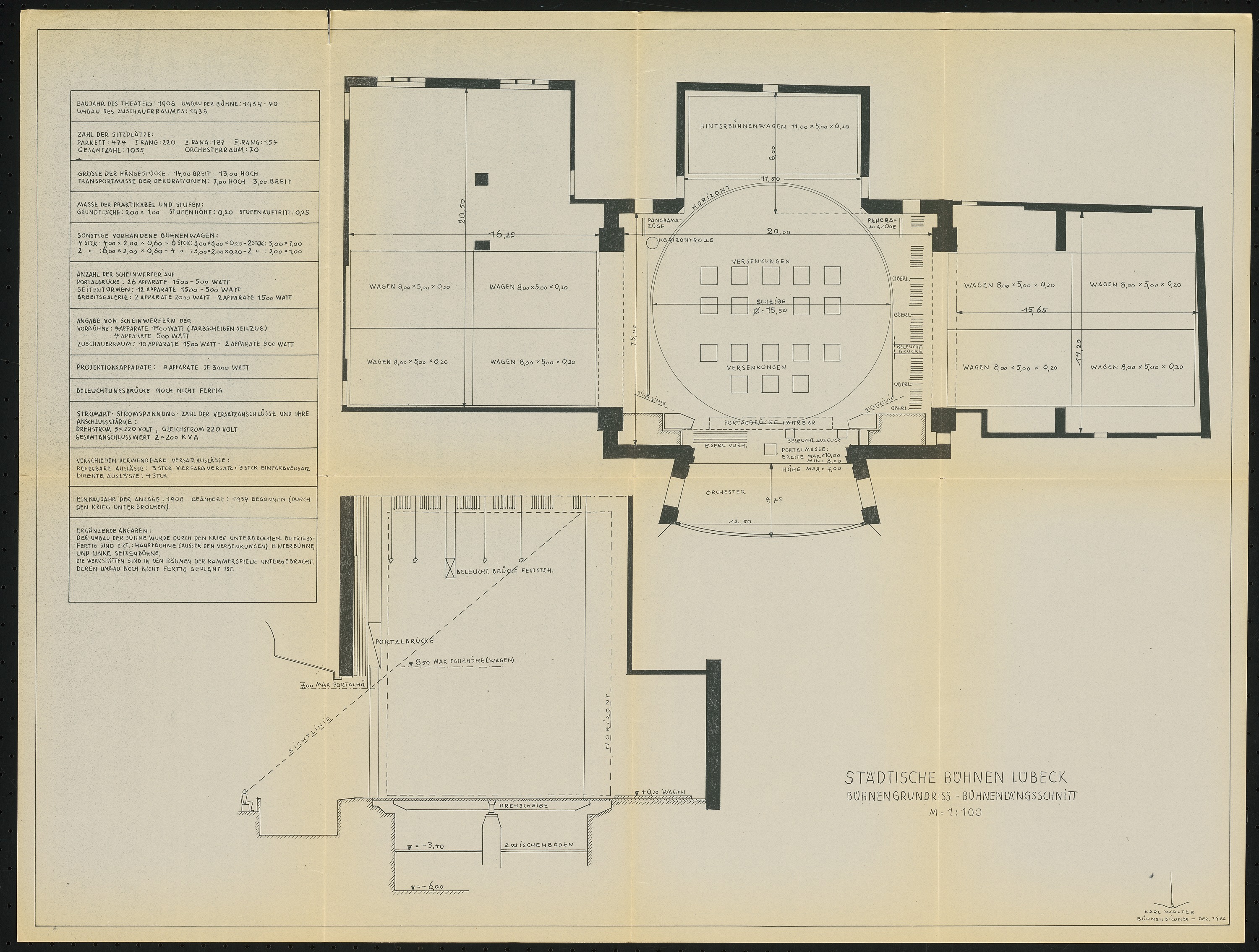 Bühnengrundriss und Bühnenlängsschnitt 1:100
