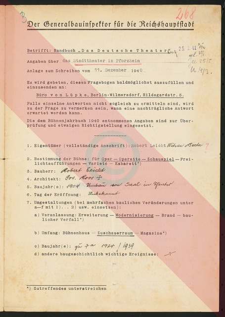 Fragebogen für das Handbuch »Das Deutsche Theater«, vierseitiges Dokument