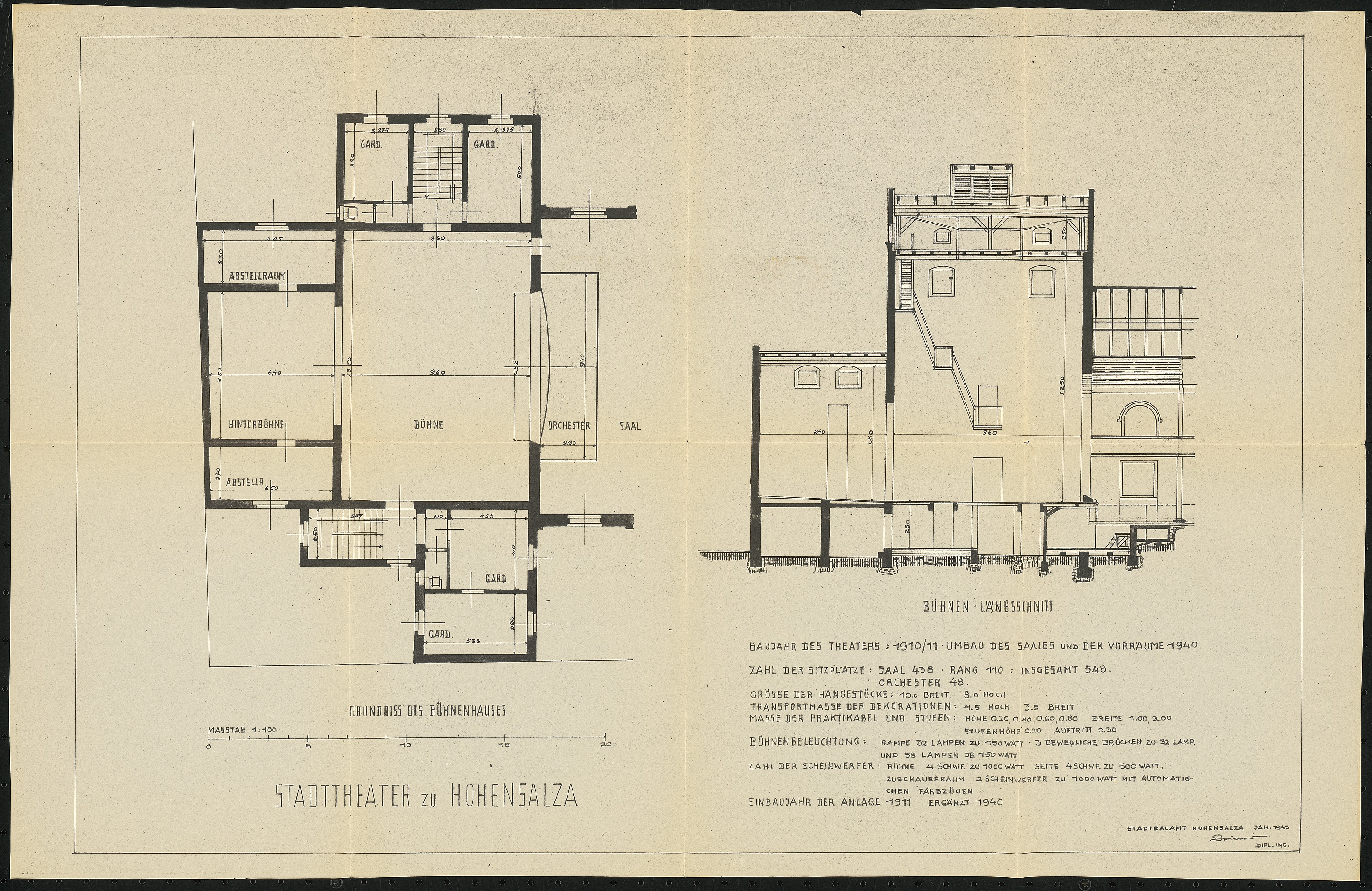 Bühnengrundriss und Bühnenlängsschnitt 1:100
