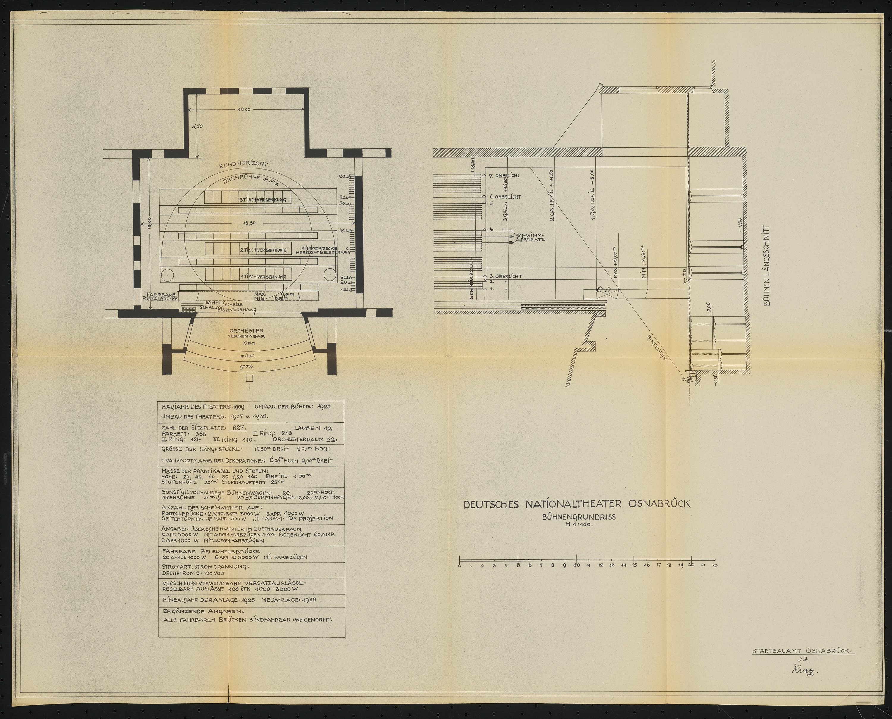 Bühnengrundriss und Bühnenlängsschnitt 1:100