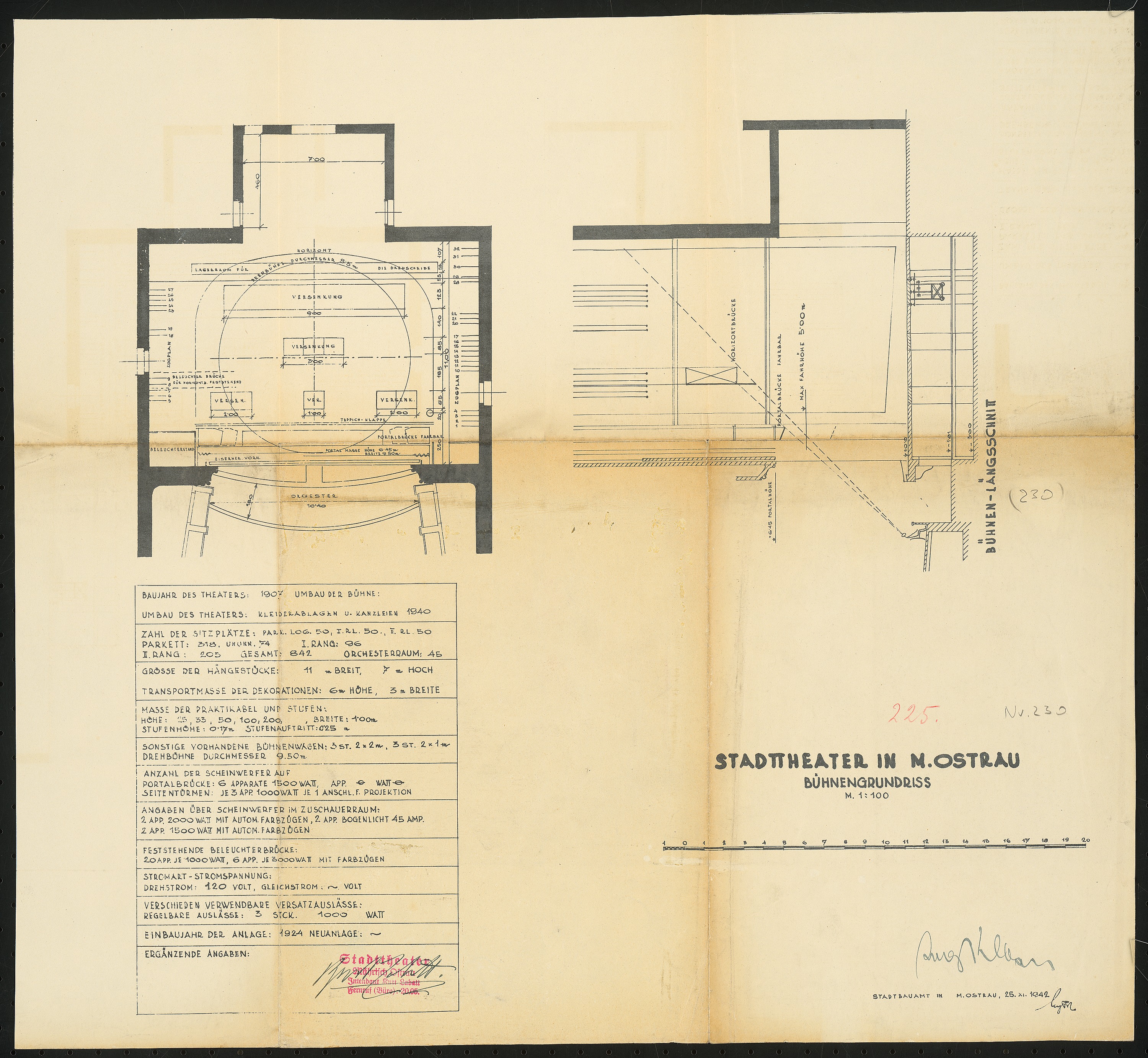 Bühnengrundriss und Bühnenlängsschnitt 1:100