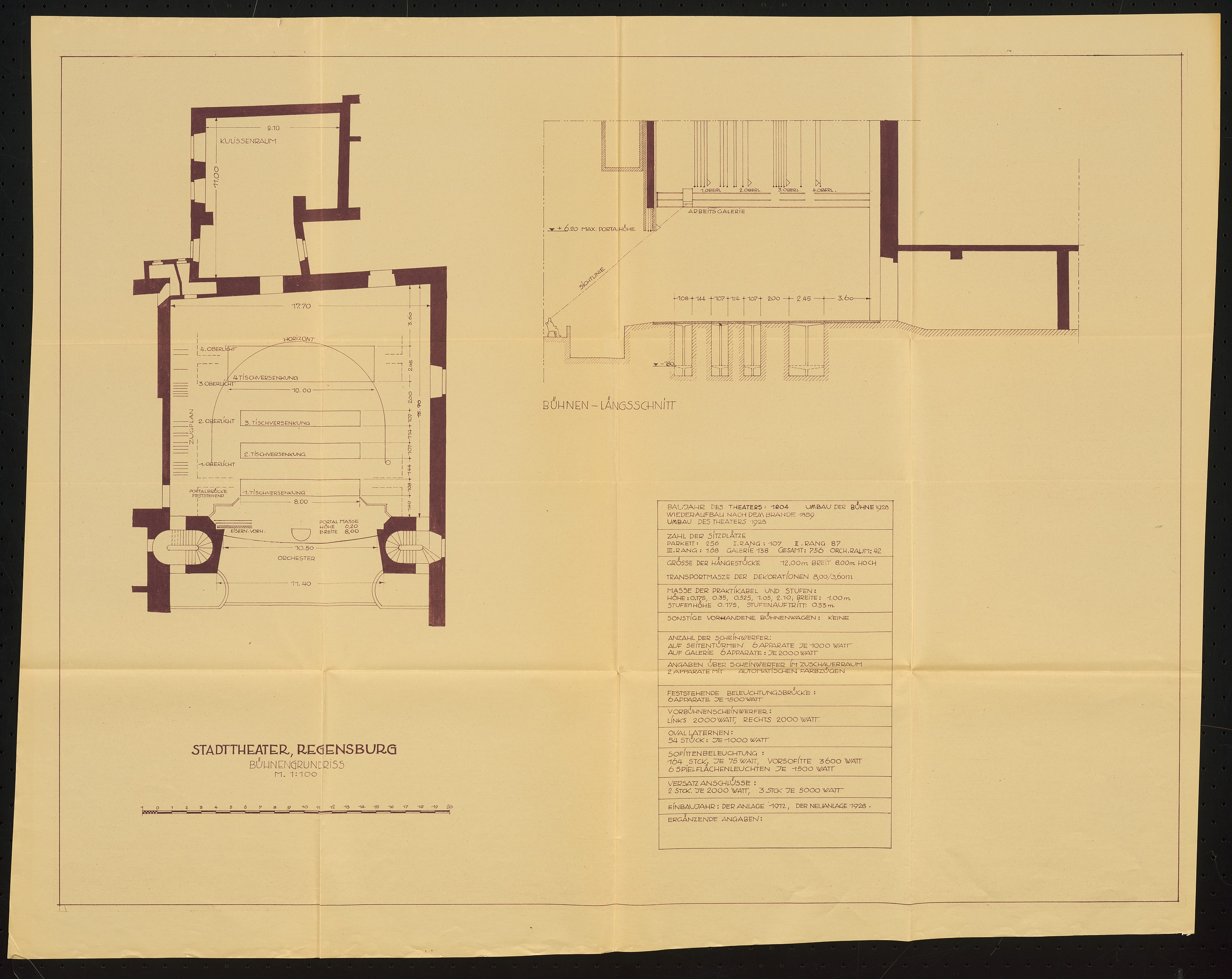 Bühnengrundriss und Bühnenlängsschnitt 1:100