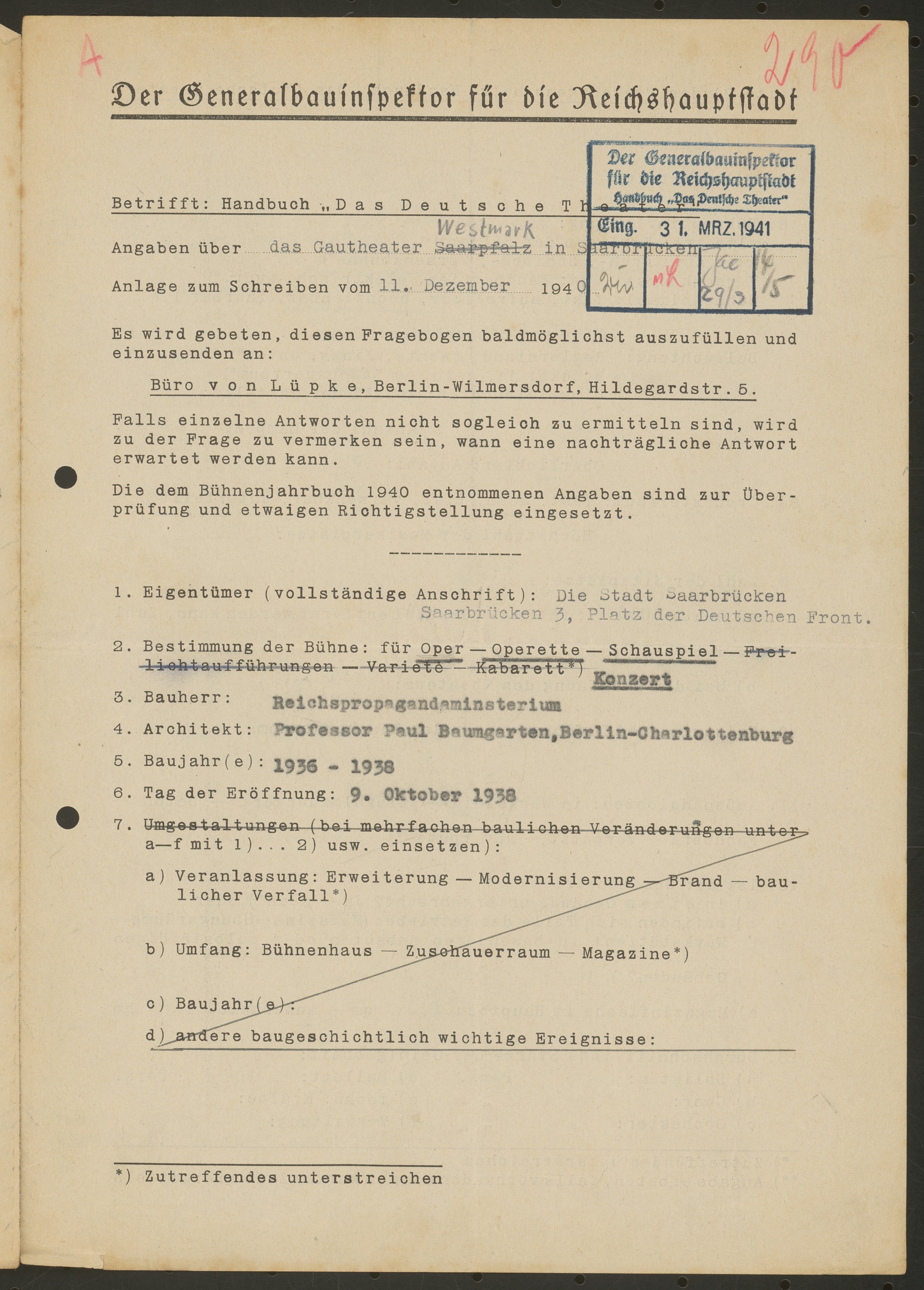Gautheater Westmark (auch: Grenzlandtheater Saarpfalz, Saarländisches Staatstheater), Saarbrücken
