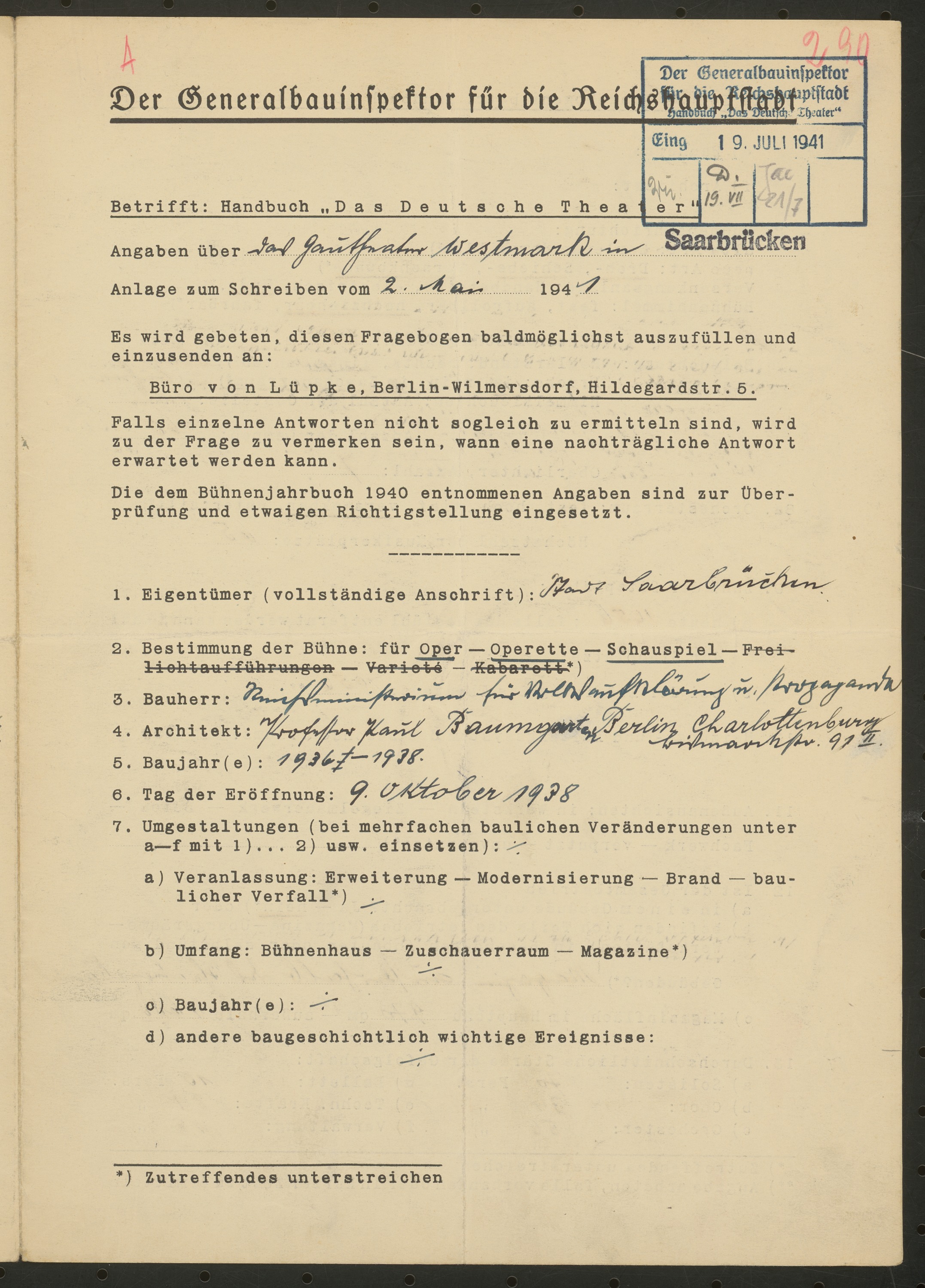 Gautheater Westmark (auch: Grenzlandtheater Saarpfalz, Saarländisches Staatstheater), Saarbrücken