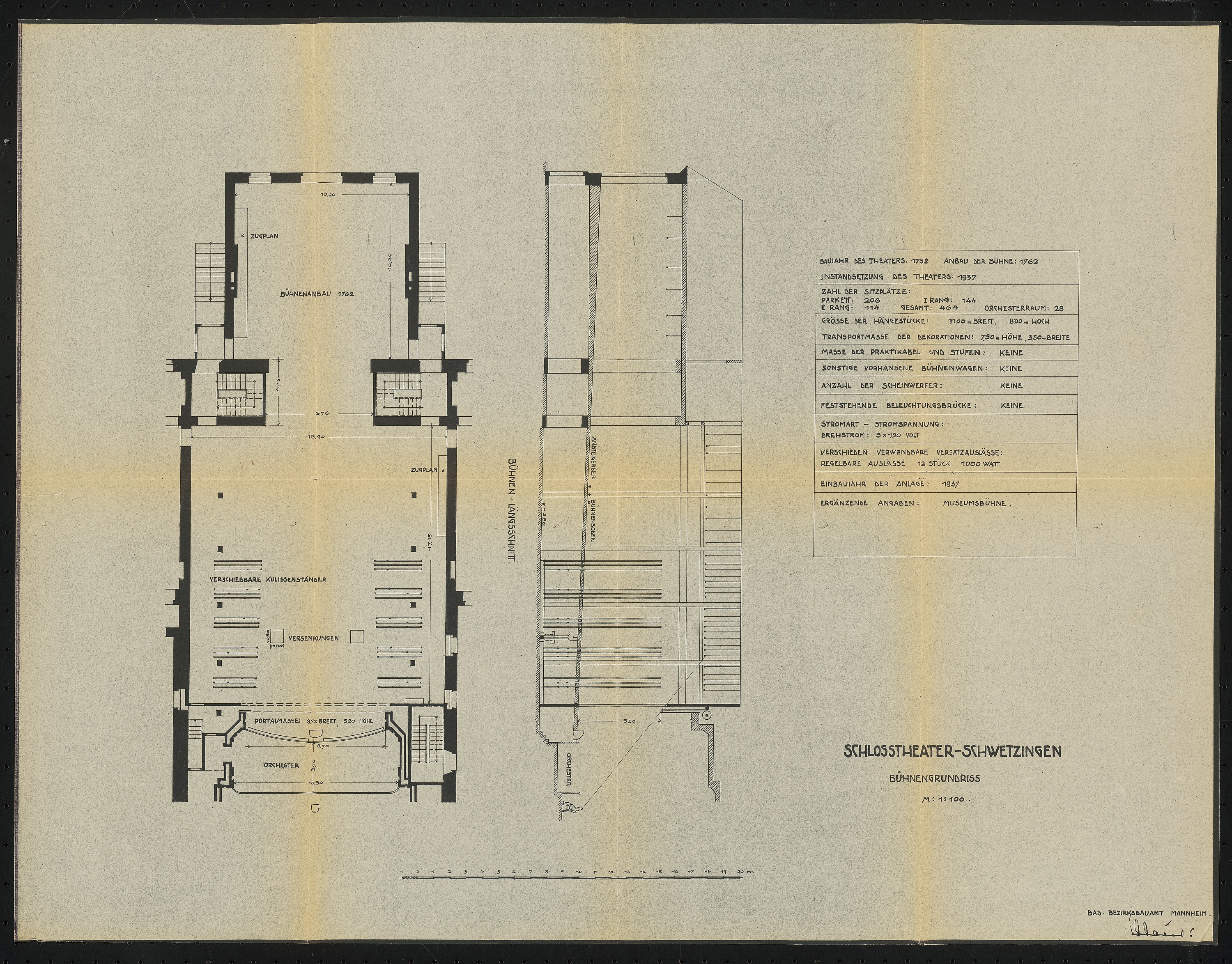 Bühnengrundriss und Bühnenlängsschnitt 1:100