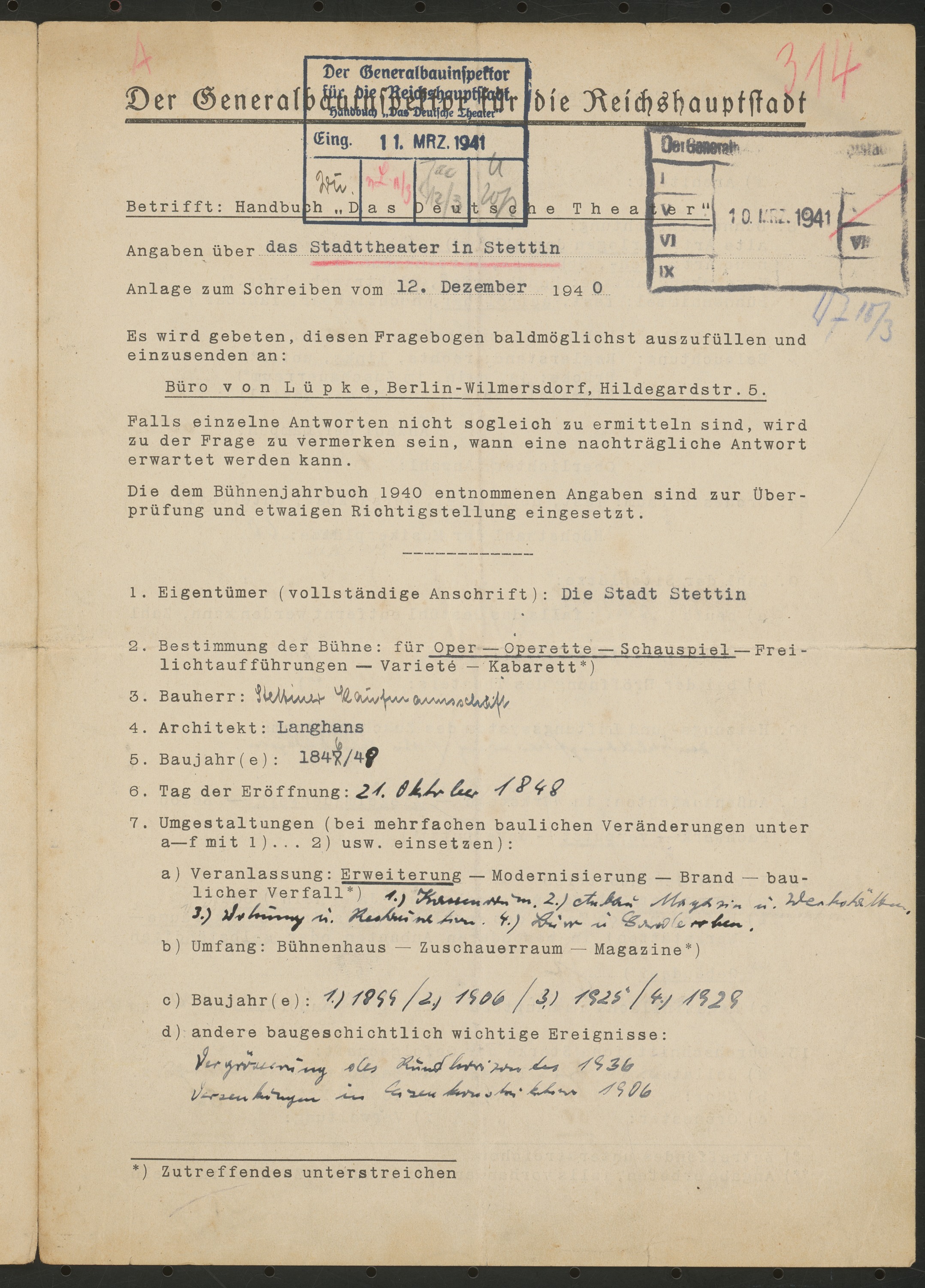 Fragebogen für das Handbuch »Das Deutsche Theater«, vierseitiges Dokument
