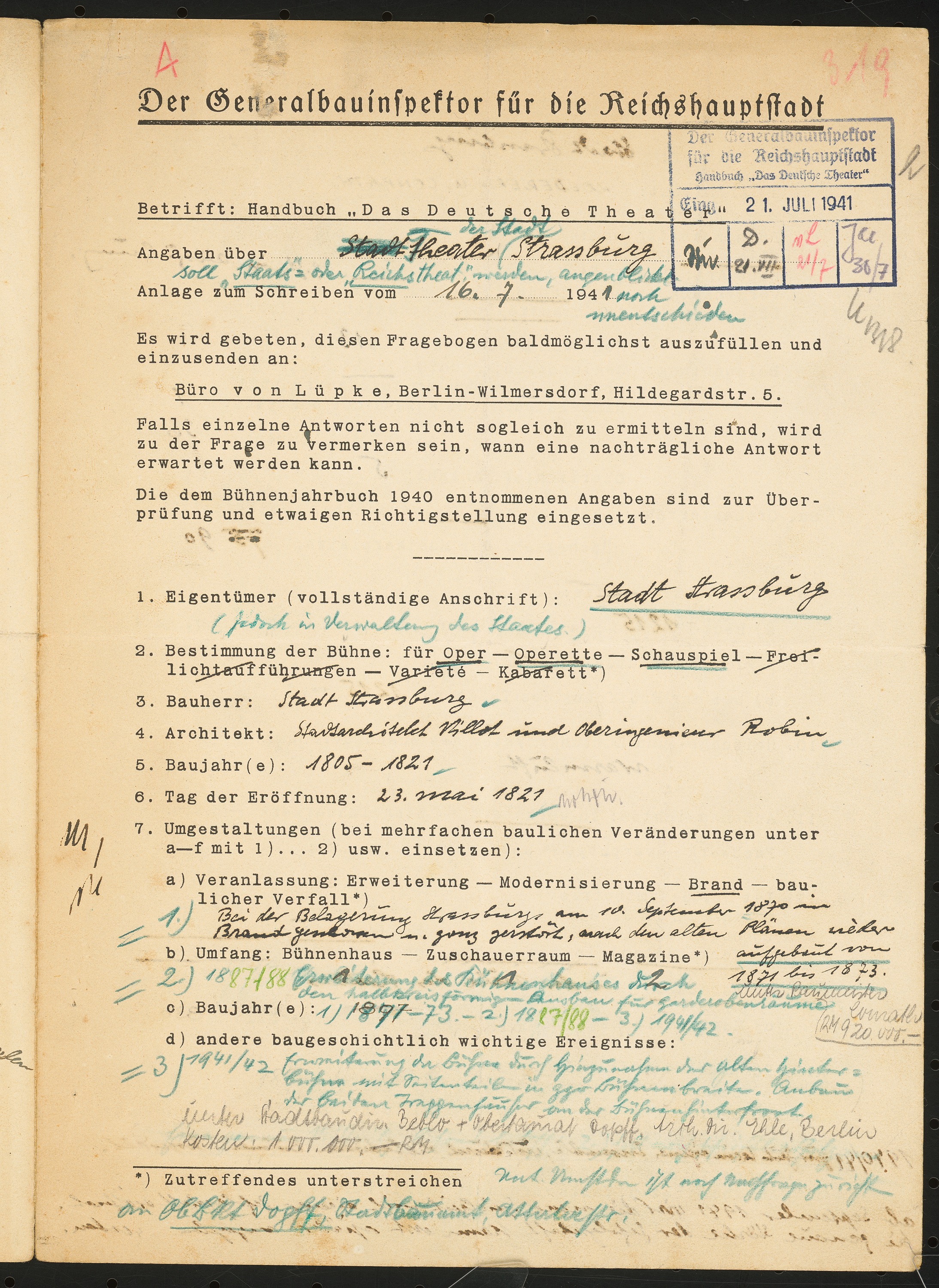 Fragebogen für das Handbuch »Das Deutsche Theater«, vierseitiges Dokument