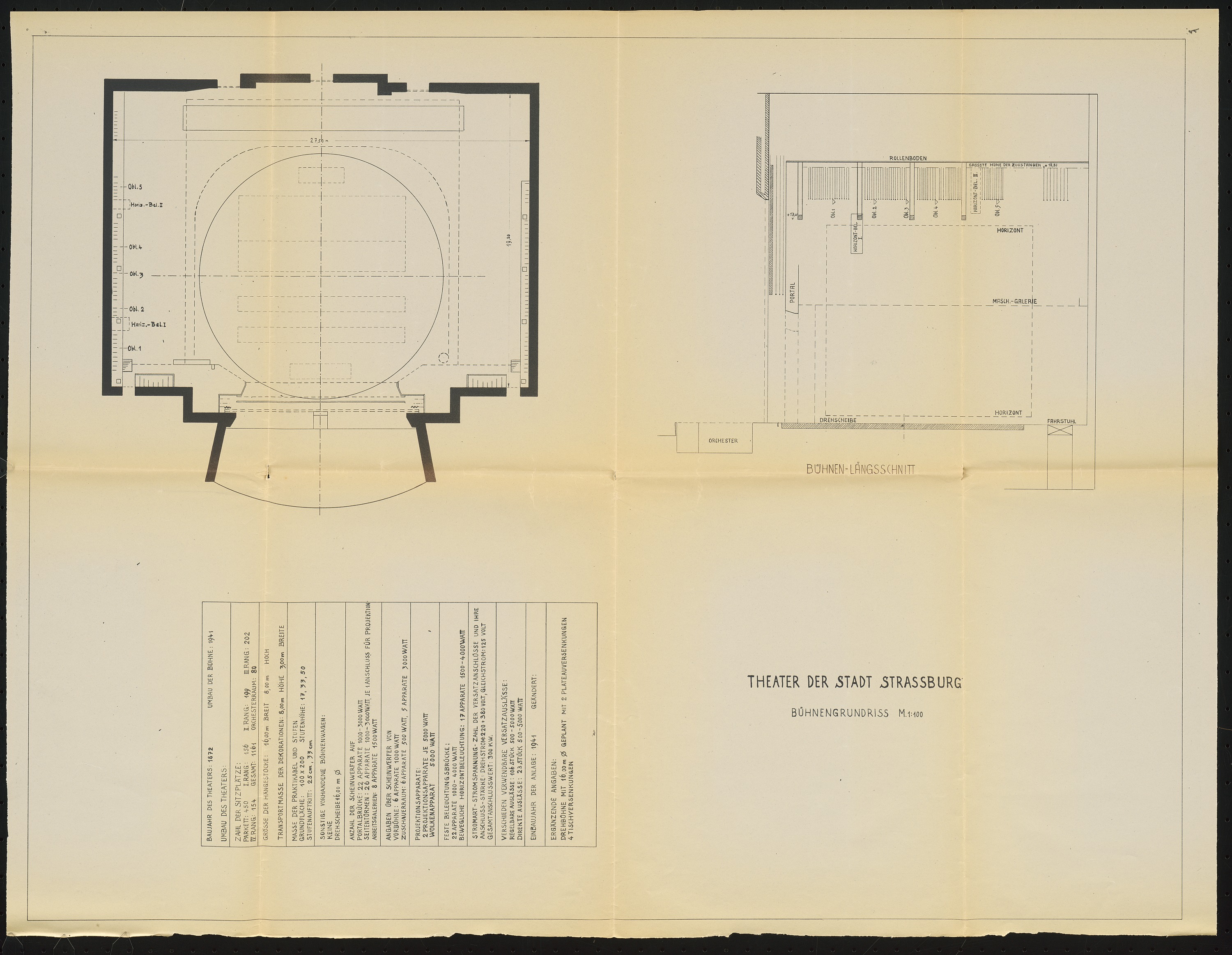 Bühnengrundriss und Bühnenlängsschnitt 1:100