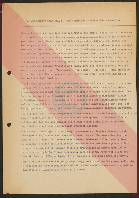 Mehrseitiges Schriftstück zur Mehrzweckhallentyp der Duisburger Stadthalle