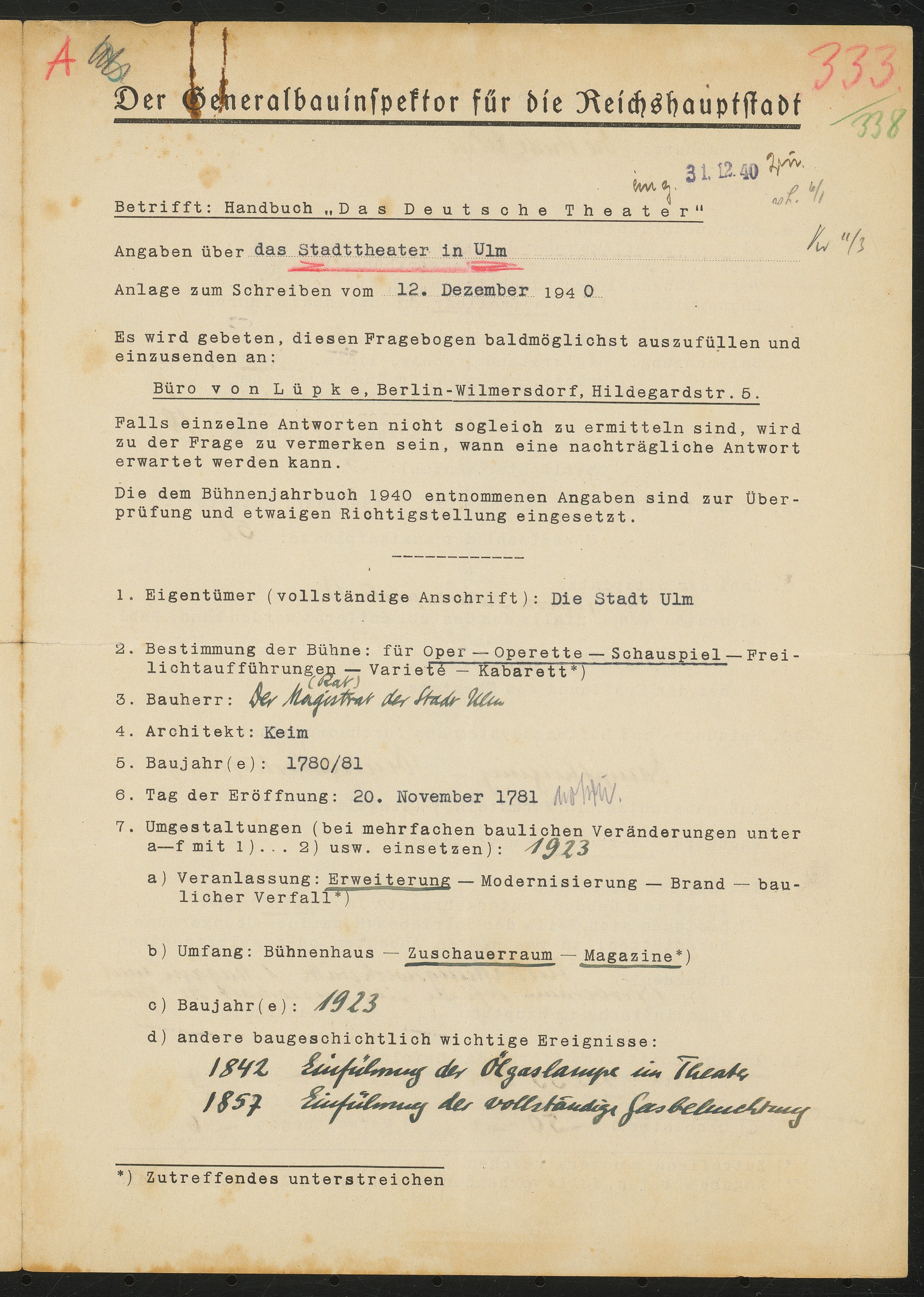 Fragebogen für das Handbuch »Das Deutsche Theater«, vierseitiges Dokument