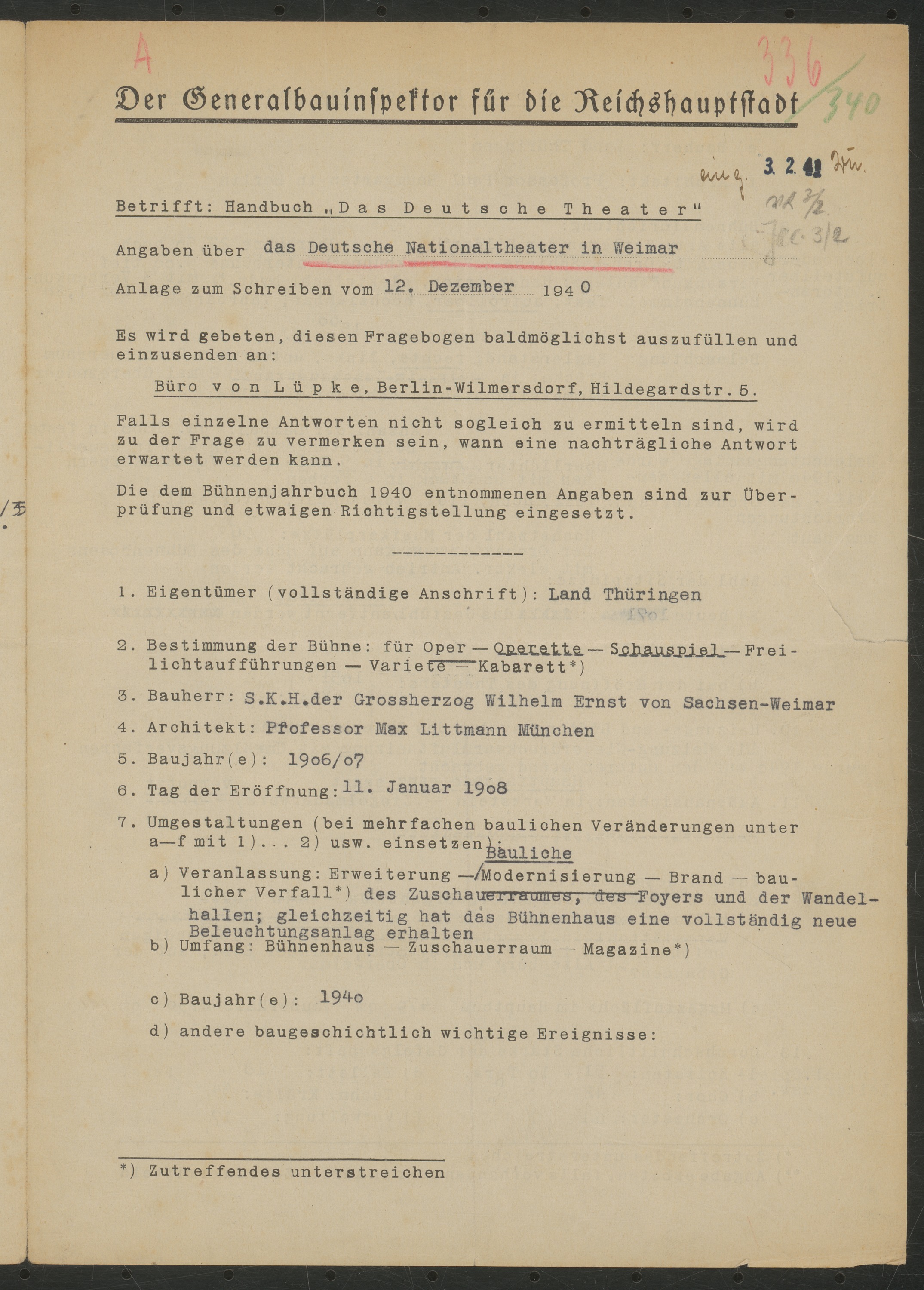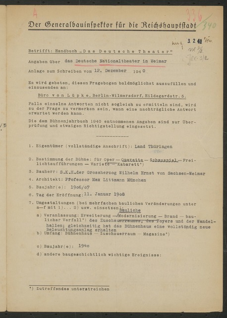 Fragebogen für das Handbuch »Das Deutsche Theater«, vierseitiges Dokument