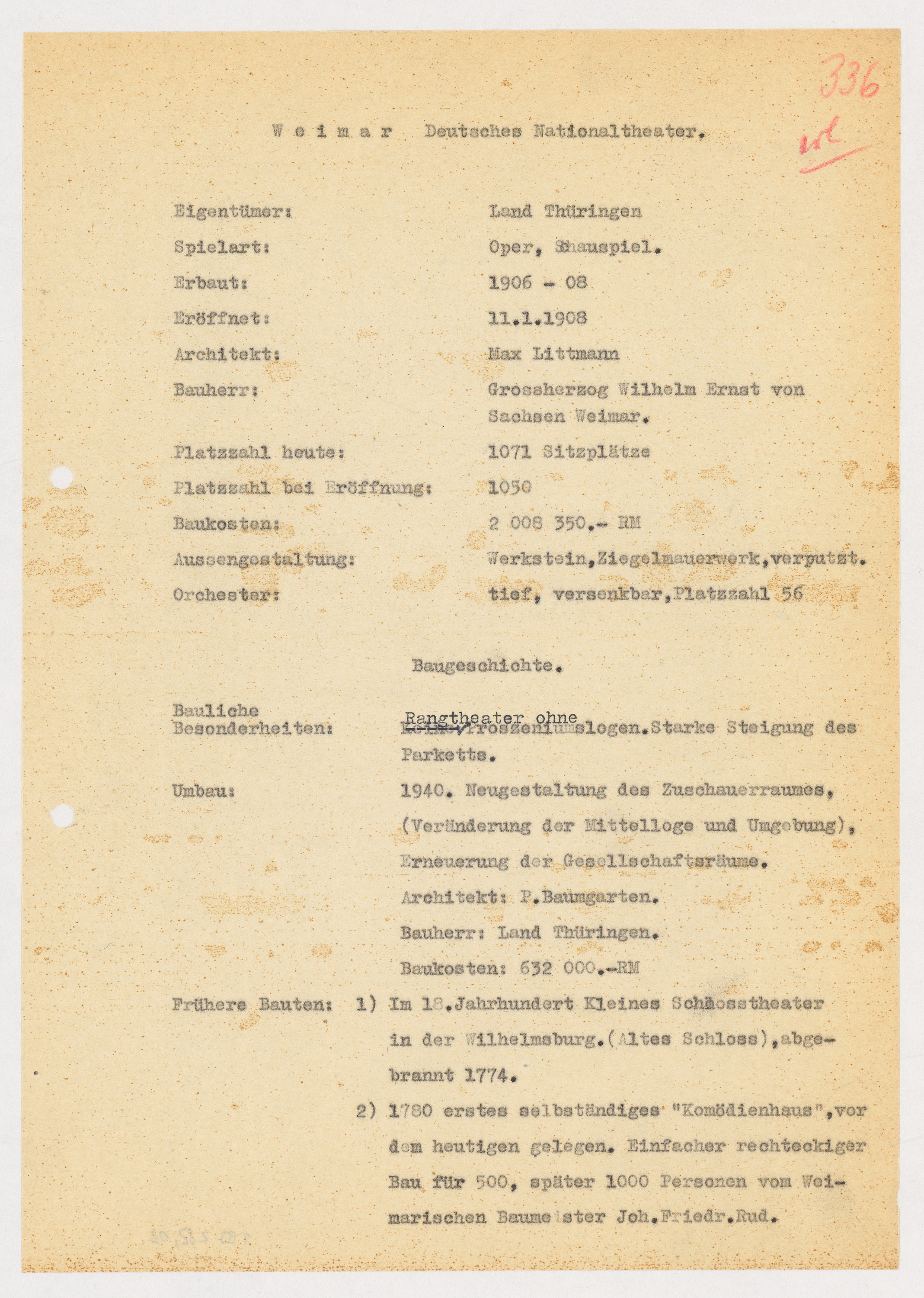 Schriftstück zum Fragebogen für das Handbuch »Das Deutsche Theater«, zwei Seiten