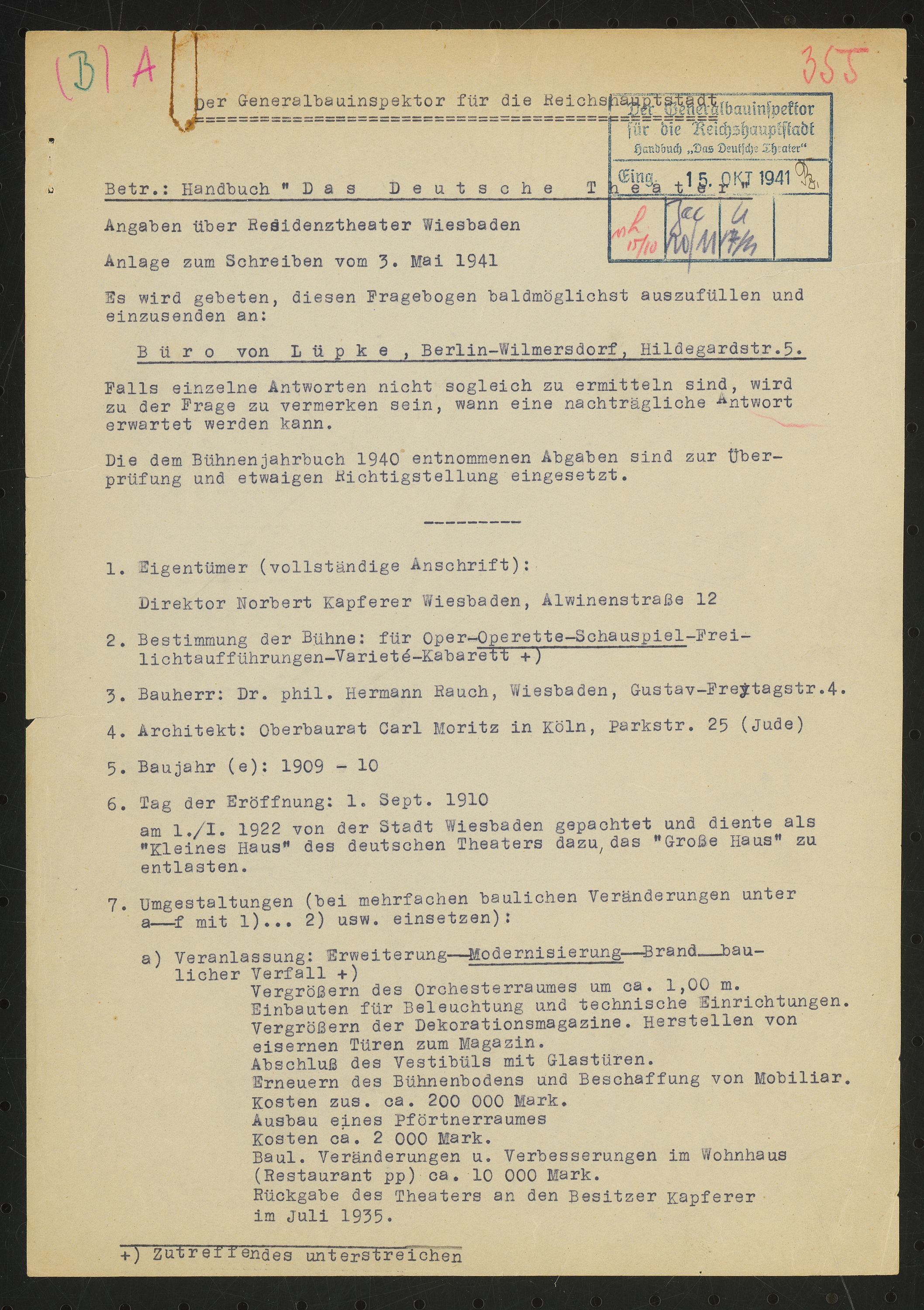 Fragebogen für das Handbuch »Das Deutsche Theater«, vierseitiges Dokument