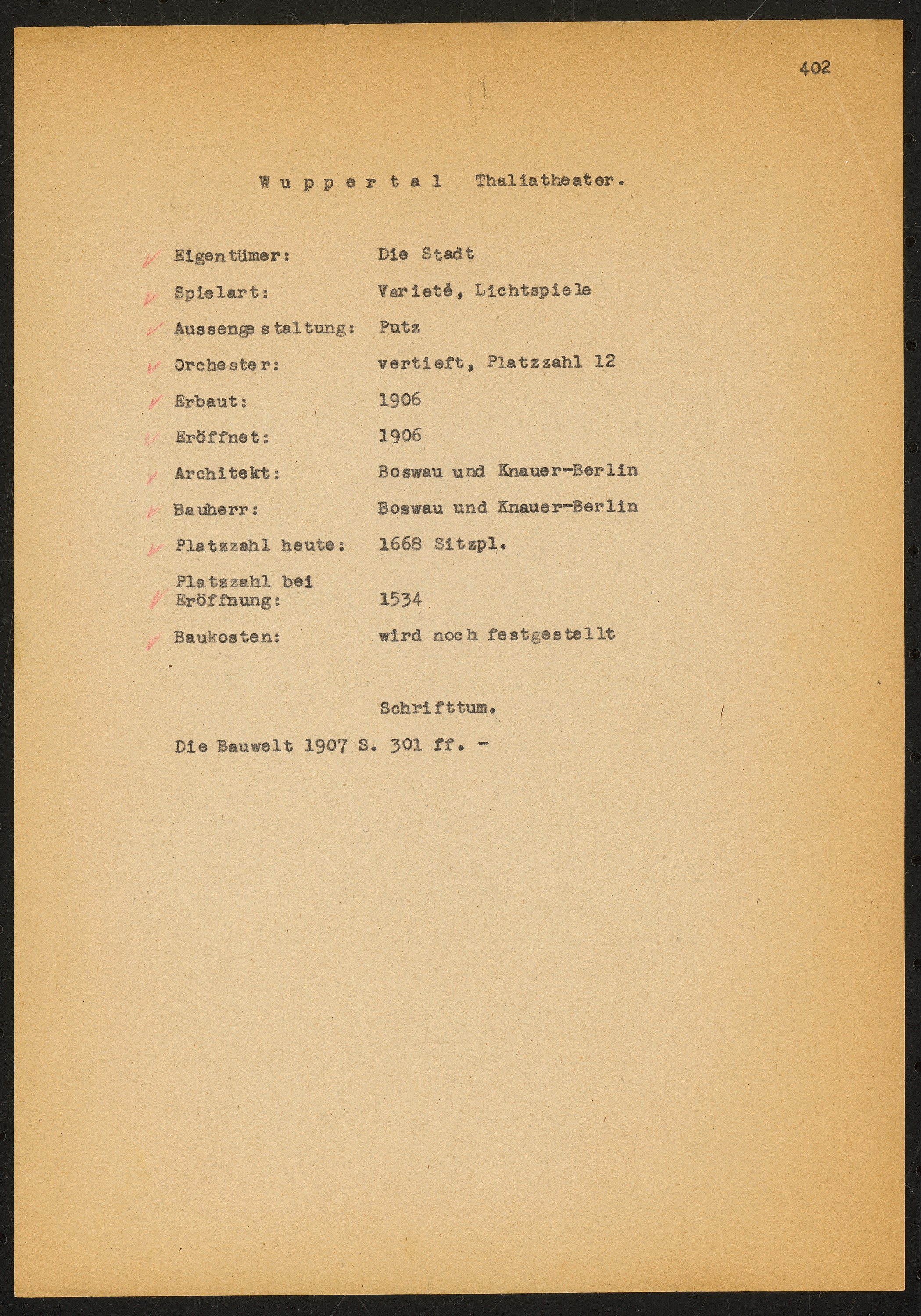 Schriftstück zum Fragebogen für das Handbuch »Das Deutsche Theater«