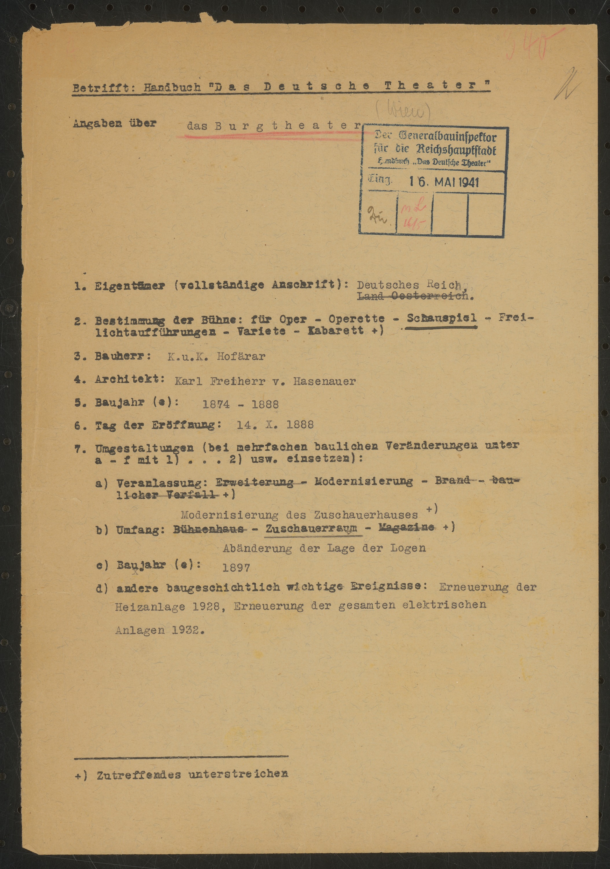 Fragebogen für das Handbuch »Das Deutsche Theater«, vierseitiges Dokument