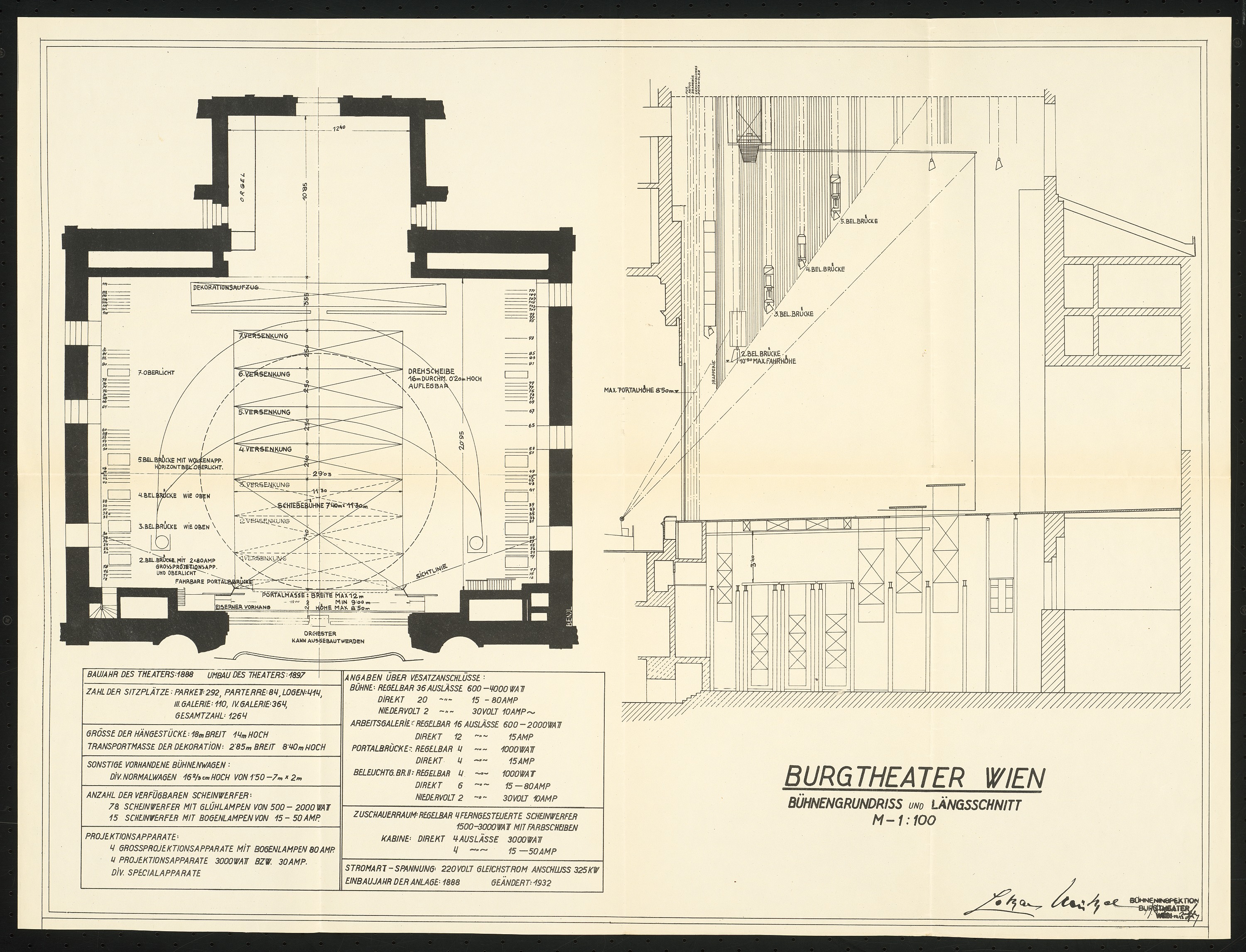 Bühnengrundriss und Bühnenlängsschnitt 1:100
