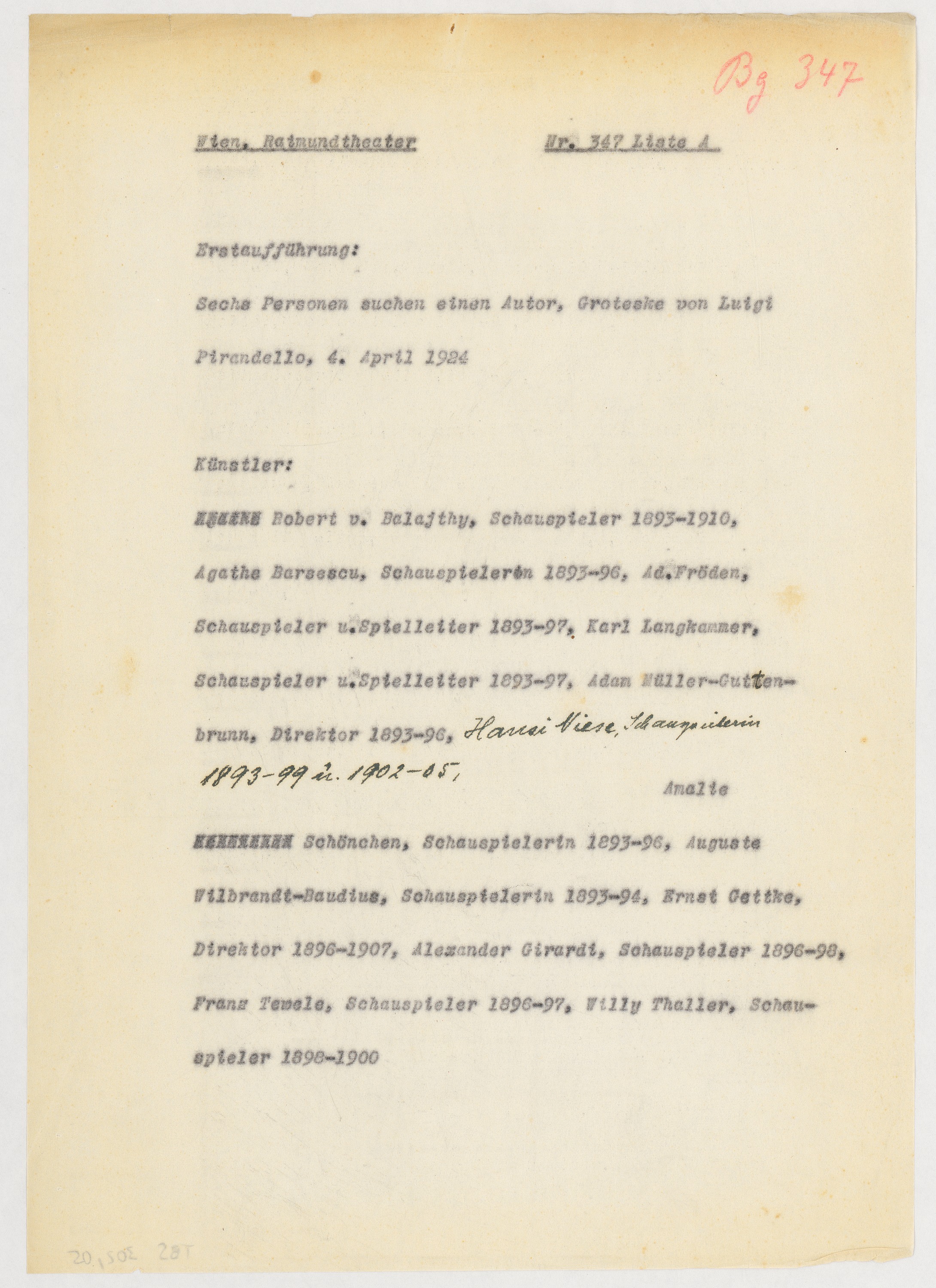 Schriftstück zum Fragebogen für das Handbuch »Das Deutsche Theater«