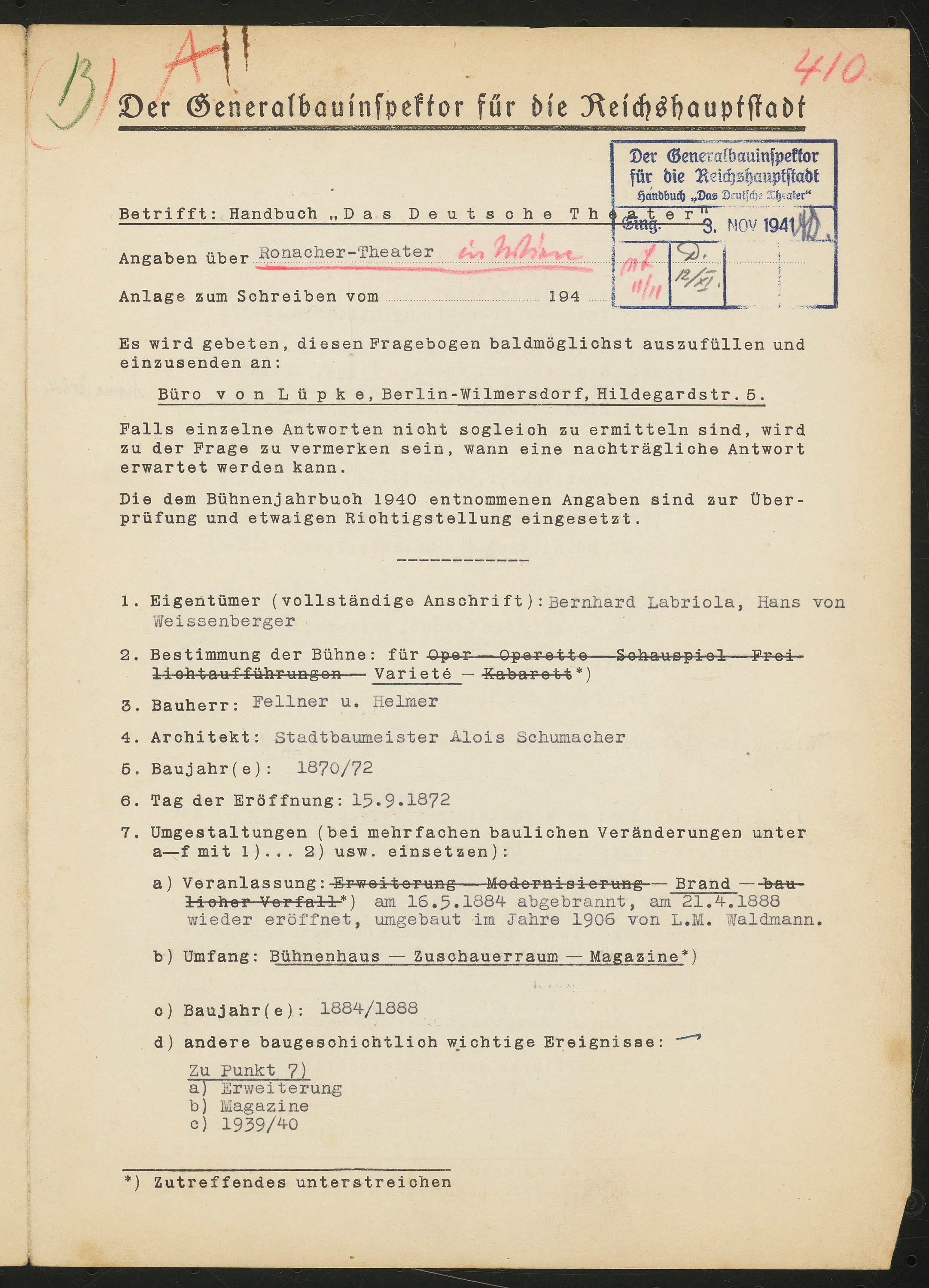 Fragebogen für das Handbuch »Das Deutsche Theater«, vierseitiges Dokument