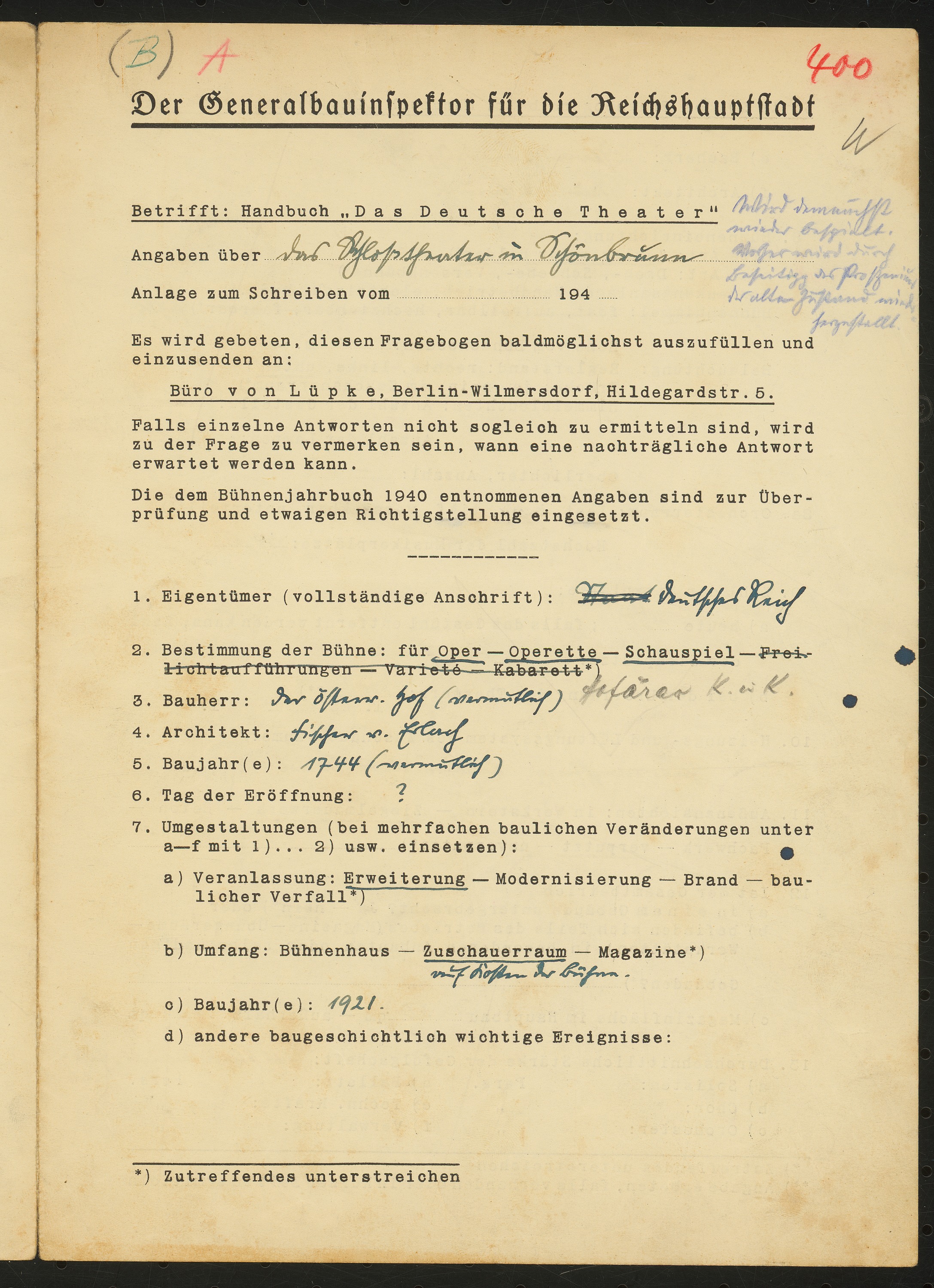 Fragebogen für das Handbuch »Das Deutsche Theater«, vierseitiges Dokument