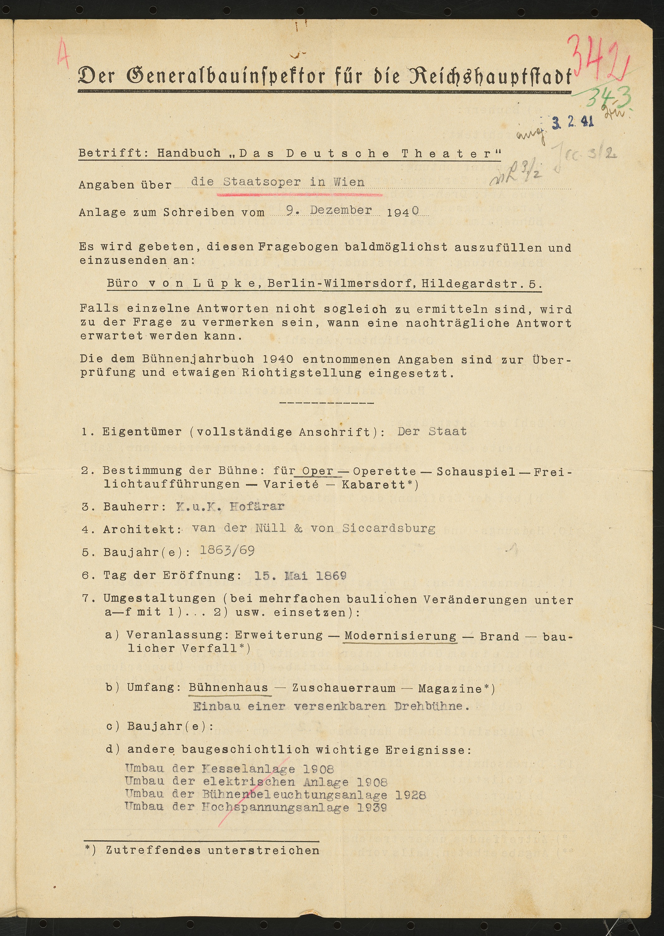 Fragebogen für das Handbuch »Das Deutsche Theater«, vierseitiges Dokument