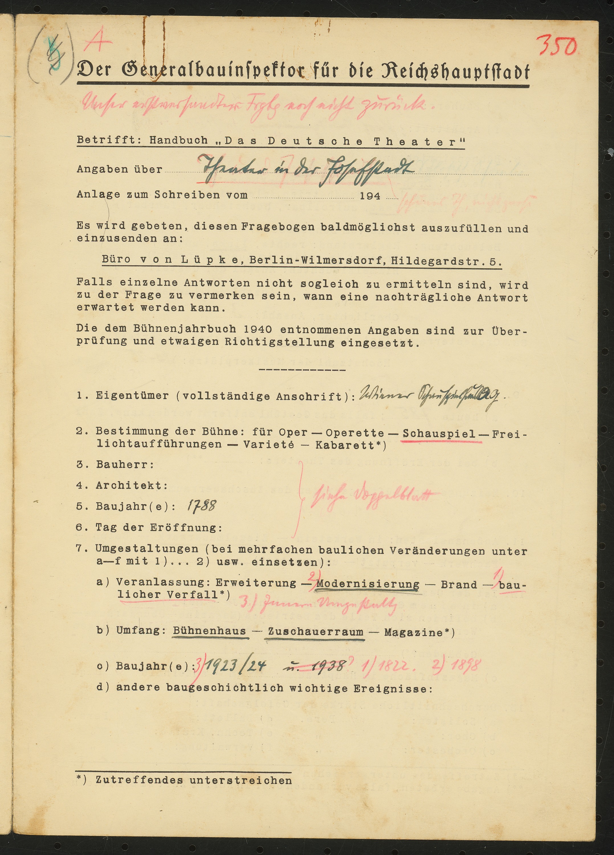 Fragebogen für das Handbuch »Das Deutsche Theater«, vierseitiges Dokument