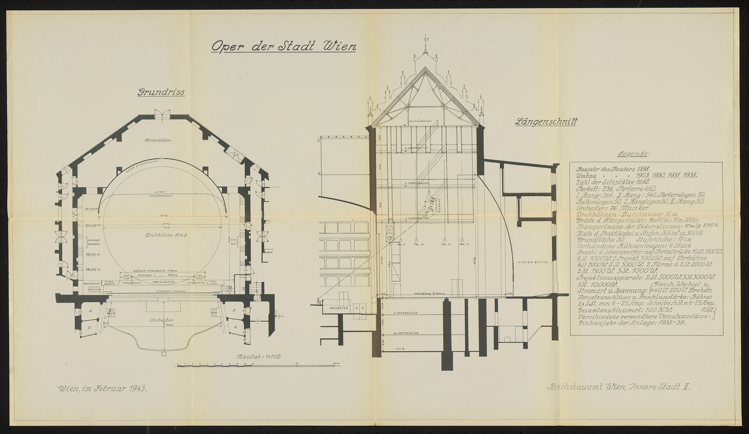 Bühnengrundriss und Bühnenlängsschnitt 1:100