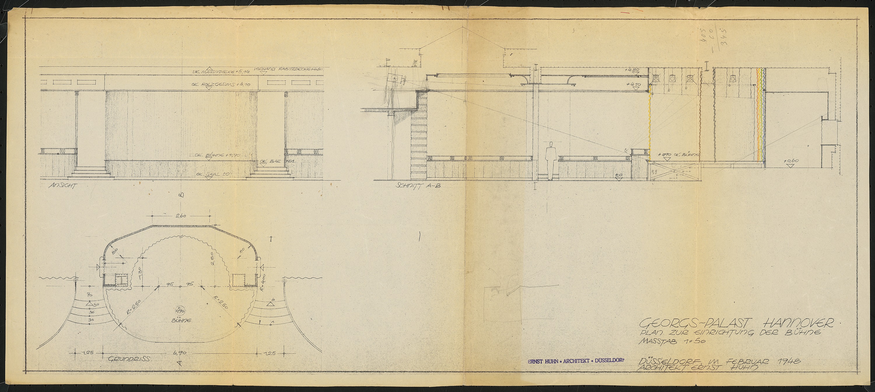 Grundriss, Ansicht und Schnitt zur Einrichtung der Bühne 1:50