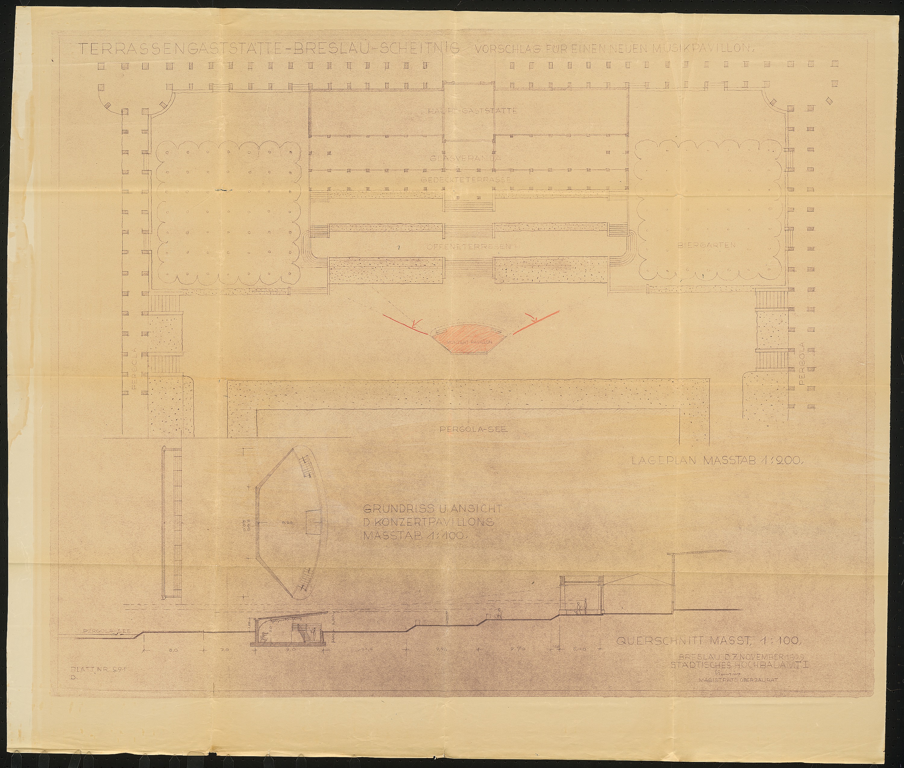 Vorschlag für neuen Konzertpavillon für Terrassengaststätte: Lageplan, Grundriss, Ansicht und Querschnitt