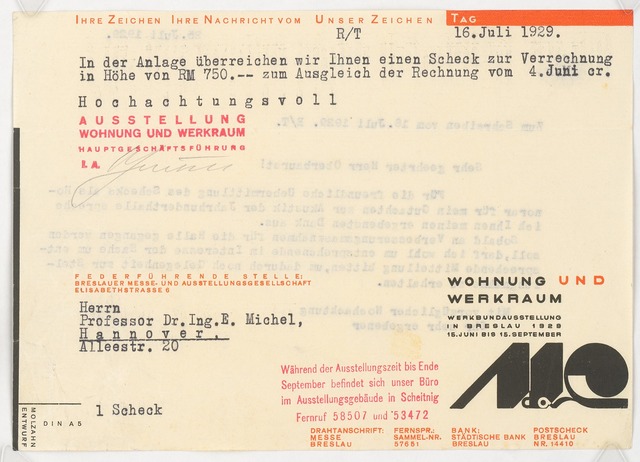 Anschreiben zu Scheck für Ausstelllung Wohnung und Werkraum an Michel und Antwortschreiben