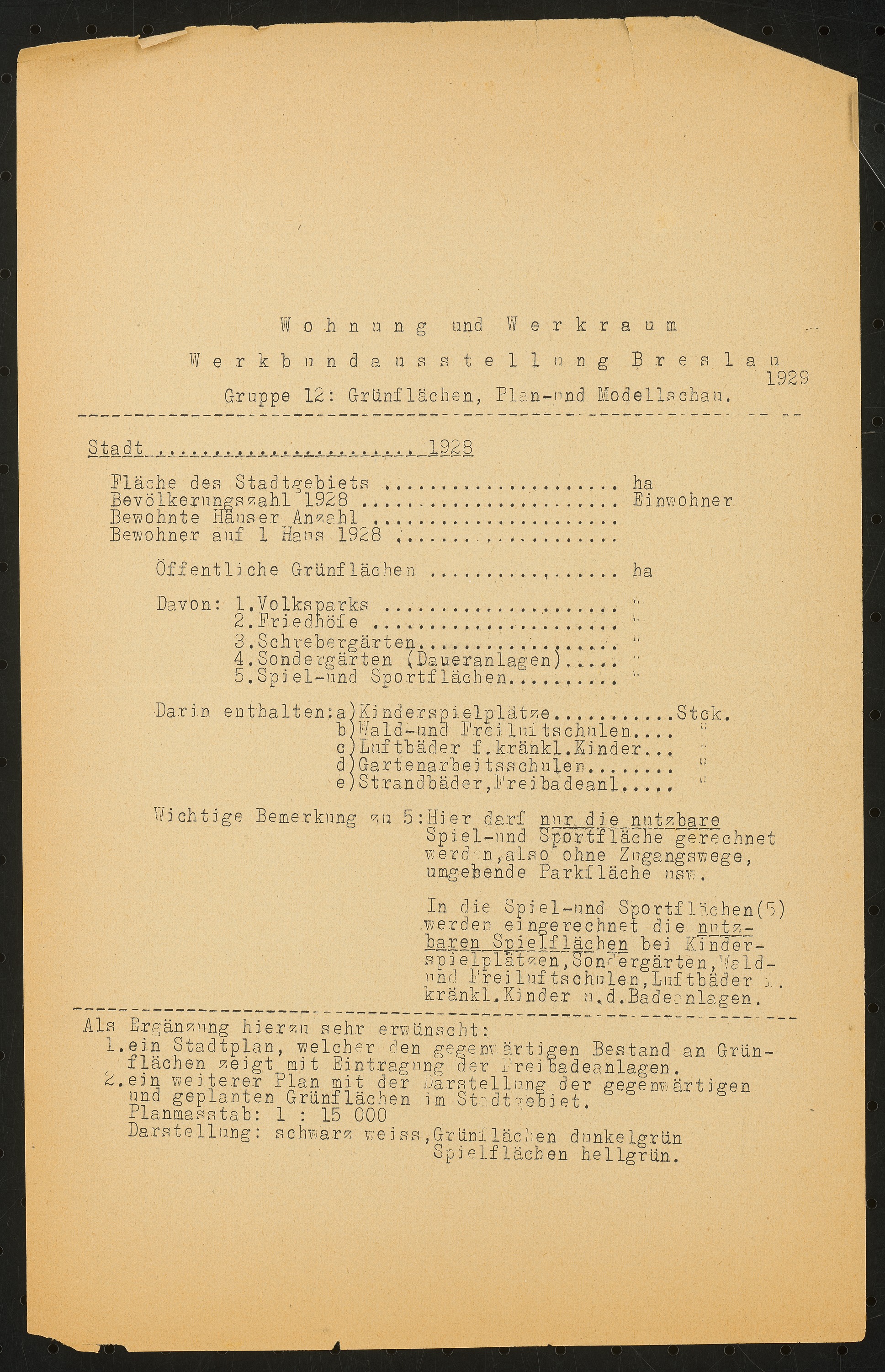 Kennzahlen zu Grünflächen zu Werkbundausstallung Breslau (zweiseitiges Schriftstück)