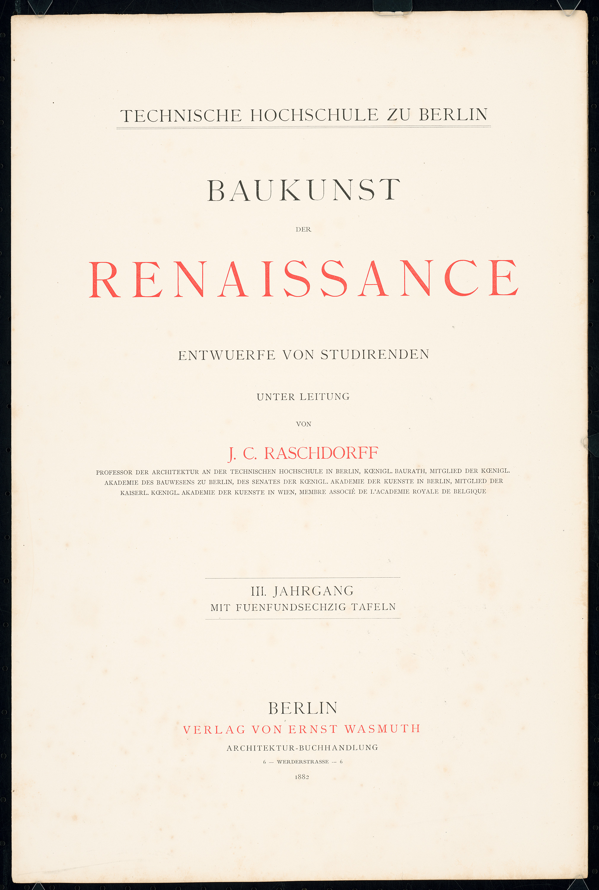 Titel, Vorwort und Inhaltsverzeichnis (aus: Baukunst der Renaissance, Entwürfe von Studirenden unter Leitung von J. C. Raschdorff, III. Jahrgang, Berlin 1882)