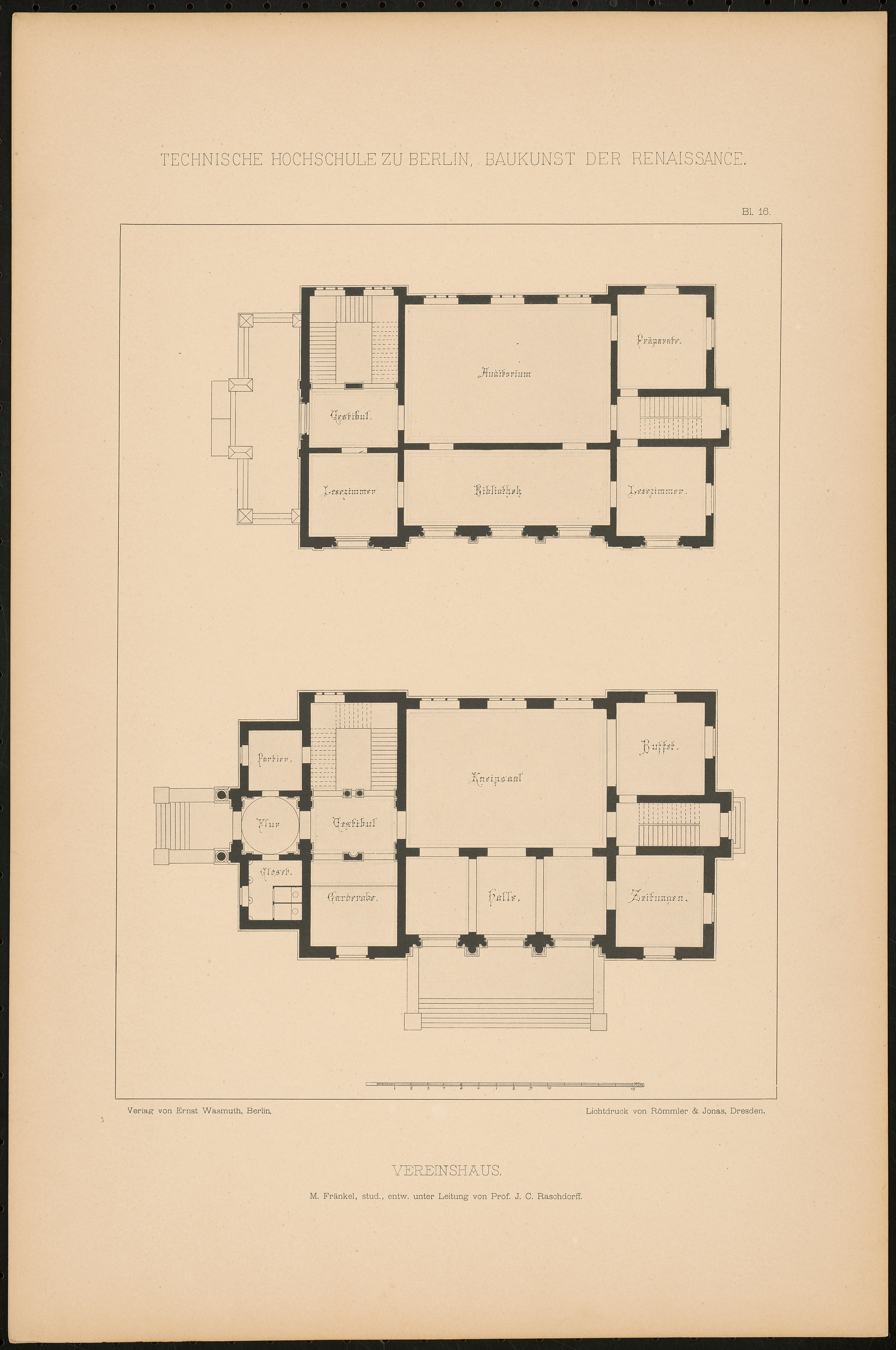 Grundrisse (aus: Baukunst der Renaissance, Entwürfe von Studirenden unter Leitung von J. C. Raschdorff, III. Jahrgang, Berlin 1882)